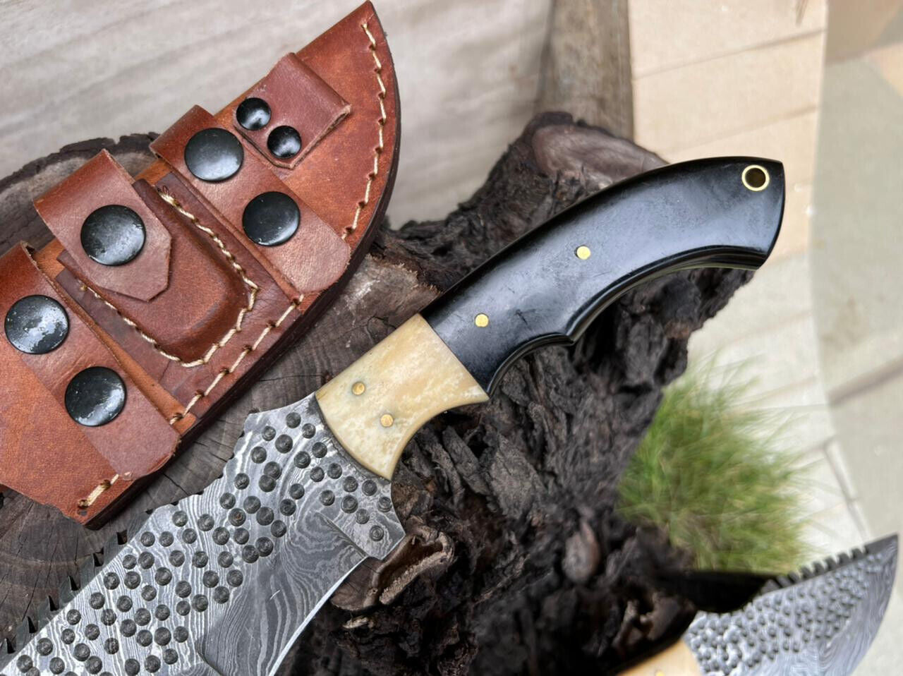 This 10.0" Custom Handmade Damascus Steel Tracker Knife is a premium full tang outdoor tool forged with precision and durability in mind. The blade is handcrafted from a combination of 1095 high carbon steel and 15N20 nickel steel, folded repeatedly to create an impressive 384-layer Damascus pattern. After acid etching, the layers reveal a striking contrast of nickel satin and dark carbon tones, making every knife unique.The blade measures 5 inches, paired with a 5-inch polished bull horn handle, offering strength, comfort, and an excellent grip. The full tang construction ensures maximum reliability, while the edge is carefully sharpened for hunting, camping, survival, and general outdoor use. Each knife is oil tempered to 58–60 HRC, giving it superior hardness and edge retention.A hand-stitched premium cowhide leather sheath is included for safe carry and storage, making this knife both practical and stylish. 100% handmade and crafted with attention to detail, this tracker knife is a perfect blend of functionality, craftsmanship, and collector’s appeal.