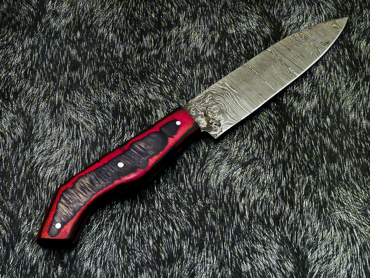 This 10.0" handmade Damascus steel chef knife is crafted for precision, durability, and elegance, making it an essential tool in any kitchen. With an overall length of 10 inches, it features a 5-inch blade and a 5-inch hardwood handle, designed to provide balance and a secure grip during use. Each blade is hand forged from 1095 and 15N20 high carbon steel, creating 512 true layers of Damascus steel. The result is a stunning natural pattern across the blade, achieved through hours of skilled forging and polishing. The knife has undergone excellent heat treatment, achieving a Rockwell hardness of 50–54 at the edge and 42–45 along the spine, ensuring long-lasting sharpness and toughness. At 4 mm thick, the blade features fine hand grinds on both sides with a false edge on the top for added style and balance. The unique saw-blade effect at the microscopic level helps maintain cutting performance, allowing the blade to remain sharp longer than standard knives. The hardwood handle is not only beautiful but also highly durable, secured with brass pins and reinforced with strong epoxy for a lifetime of reliable use. This professional chef knife combines functionality with artistry, making it perfect for chefs, collectors, and culinary enthusiasts.