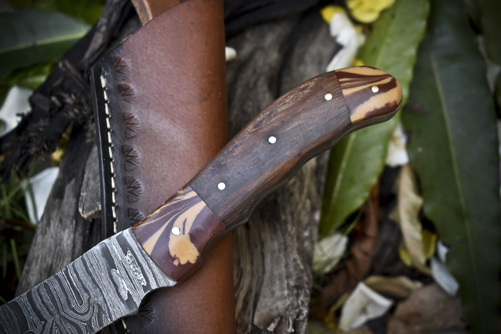 This damascus skinner knife measures approximately 10 inches overall, with a 5-inch blade and a 5-inch handle made from premium walnut wood, complemented by a Micarta bolster for enhanced grip and durability. The blade is crafted from a layered blend of 1095 and 15N20 steels, hand forged and oil tempered to 58-60 HRC, ensuring a sharp, rigid edge ideal for hunting, trapping, wood cutting, and skinning tasks. The knife features a captivating twist pattern in the Damascus steel, showcasing swirling lines that create a vivid sense of motion and energy across the blade’s surface. This bold pattern contrasts deep blacks with bright silvers, producing a dynamic, eye-catching finish that highlights the craftsmanship. This handmade skinner damascus knife comes with a thick, hand-tooled leather sheath built to withstand rugged outdoor use. Each knife is unique, crafted without CNC machining or blanks, reflecting true artisan skill. Perfect as a collectible or gift for hunters, hikers, and outdoor enthusiasts who value quality and tradition. Made in Pakistan