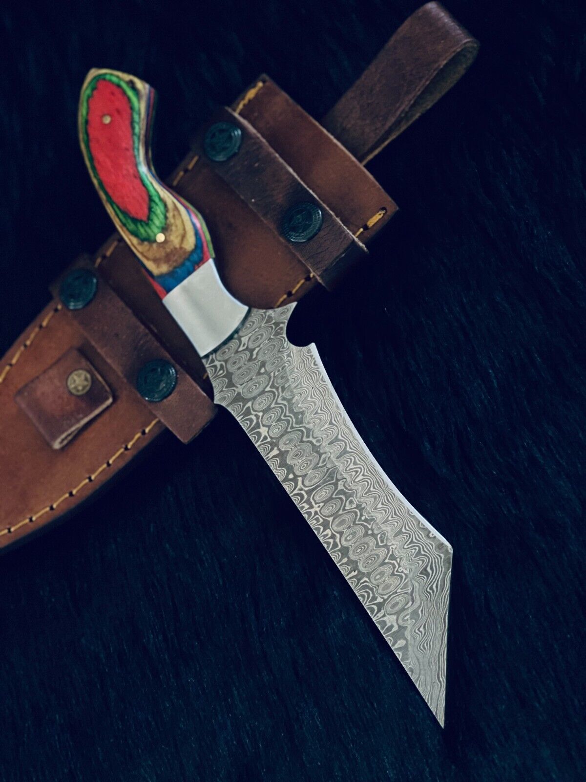 Discover unparalleled craftsmanship with the Heritage Forge 10.5" Custom Handmade Rain Drop Damascus Tanto Bowie Hunting Knife. This knife features a hand-forged Damascus steel blade, meticulously crafted from 1095 high carbon and 15N20 nickel steel folded into 512 layers, resulting in the striking Rain Drop Damascus pattern that extends seamlessly to the cutting edge. The full tang construction ensures exceptional durability, balance, and strength, making it ideal for hunting, camping, and survival use. With a robust 4 mm thick blade, this tanto-style Bowie is heat-treated to a Rockwell hardness of 54, maintaining long-lasting sharpness and precision. The handle is a blend of stained camel bone and natural wood with brass spacers, providing a secure and ergonomic grip while accentuating the knife’s artistic design. A handmade Damascus steel bolster adds both reinforcement and elegance. Every Heritage Forge knife is 100% handmade, reflecting hours of skilled labor, making each piece unique. Perfect for collectors and outdoor enthusiasts, this custom Rain Drop Damascus Tanto Bowie knife delivers both functional performance and visual appeal. Heritage Forge ensures each knife is not only a reliable tool but also a masterpiece of craftsmanship, built to impress and endure.