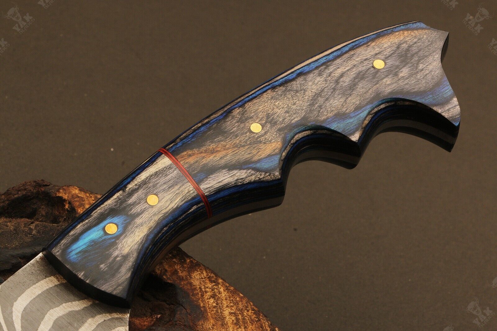 The handle showcases a striking combination of stained camel bone and natural wood, accented with brass spacers for strength and durability. A handmade Damascus steel bolster adds a refined touch while enhancing stability. Its full tang construction ensures superior balance and long-lasting performance, while the ergonomic grip provides comfort during extended use.