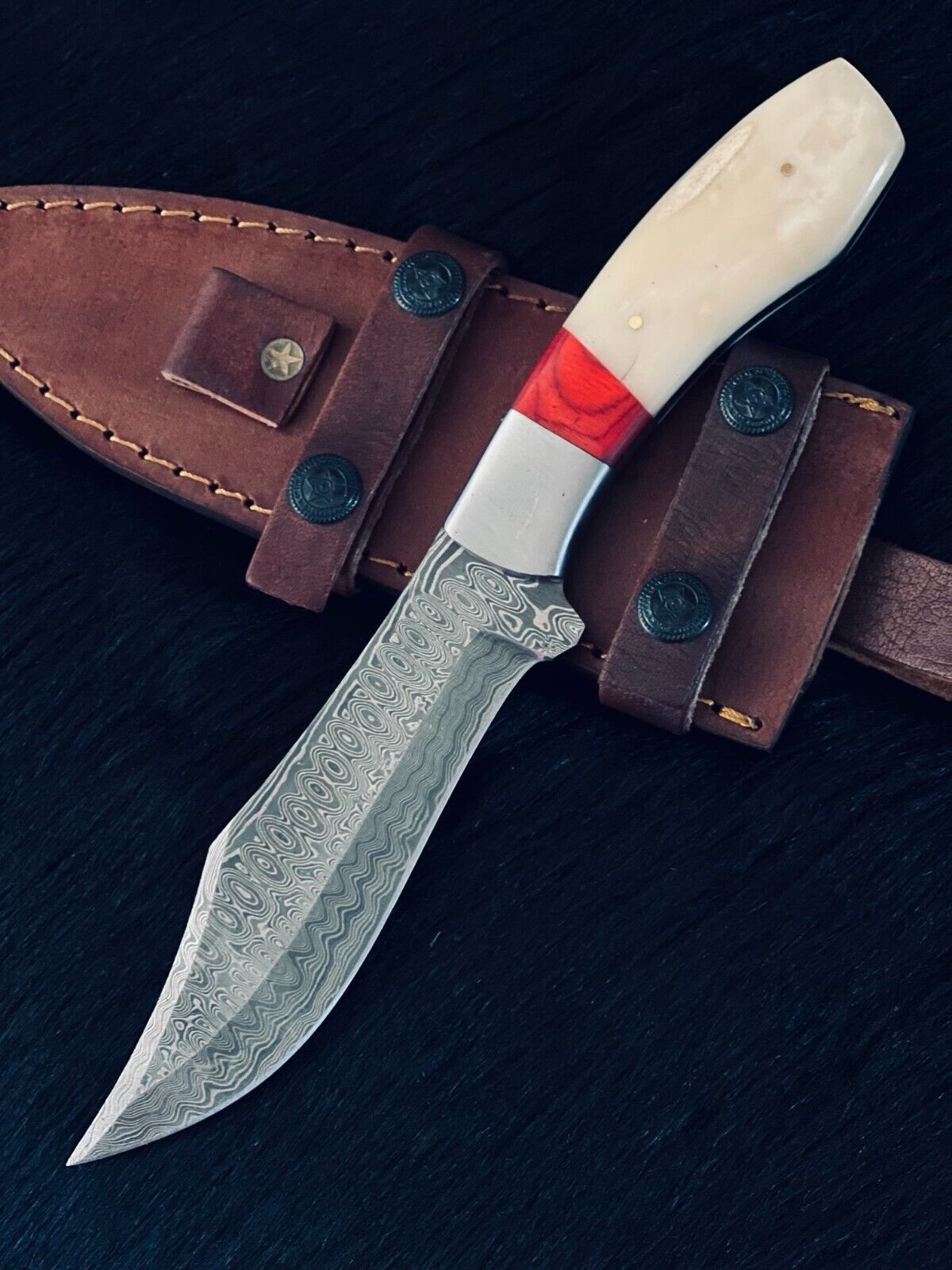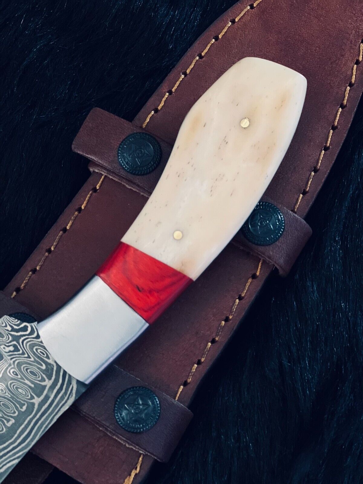 This tactical fixed blade is heat-treated for a Rockwell hardness of approximately 54 HRC along the edge, ensuring strong performance in outdoor, survival, or camping situations. The handle is a work of art, crafted from stained camel bone and natural wood, enhanced with brass spacers and a handmade Damascus bolster for perfect weight distribution and grip.