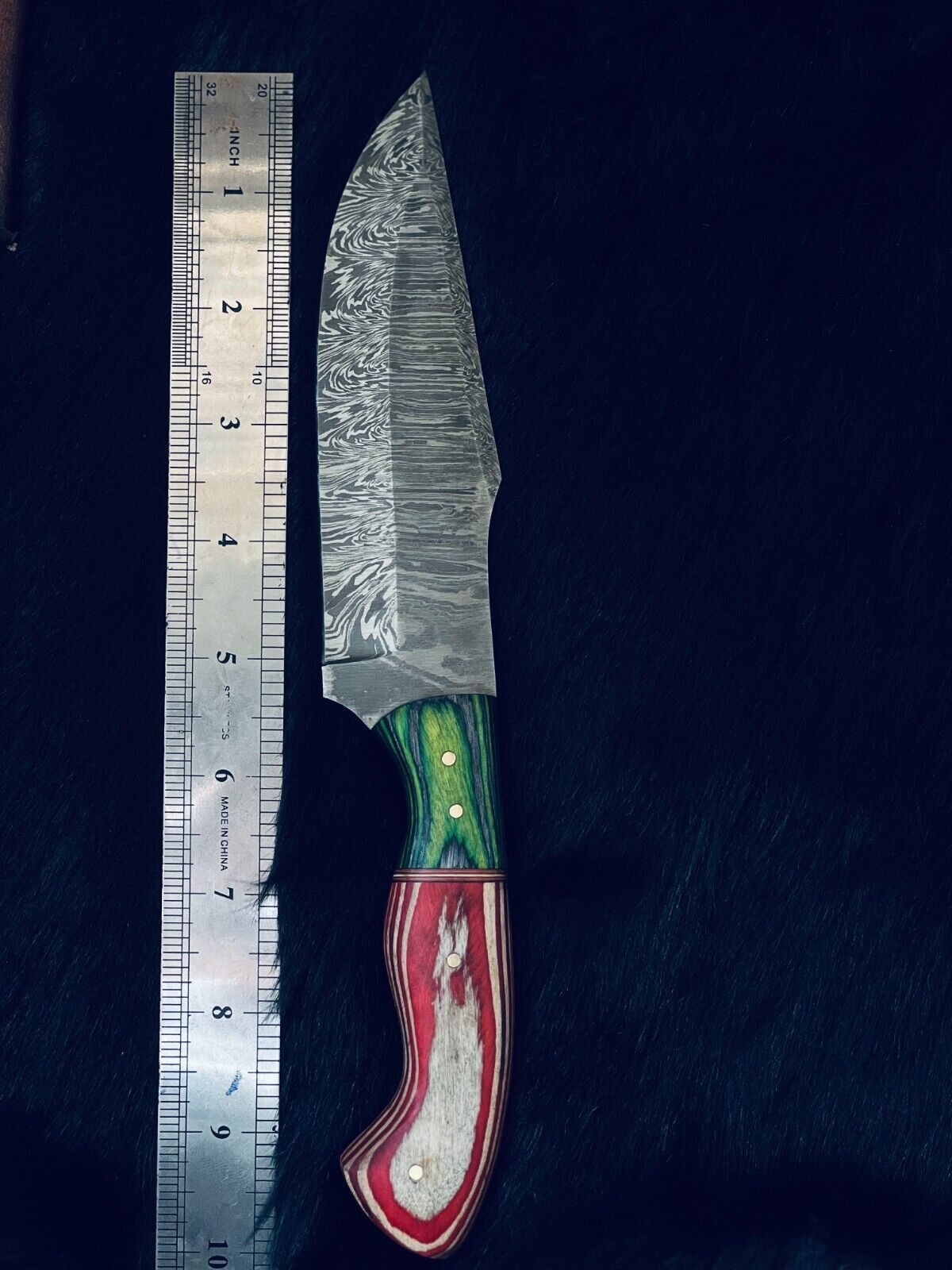 The handle is crafted from natural wood and stained camel bone, enhanced with brass spacers and a Damascus steel bolster for a rich and balanced grip. This full tang knife is built for serious cutting tasks, whether in the wild or at camp.