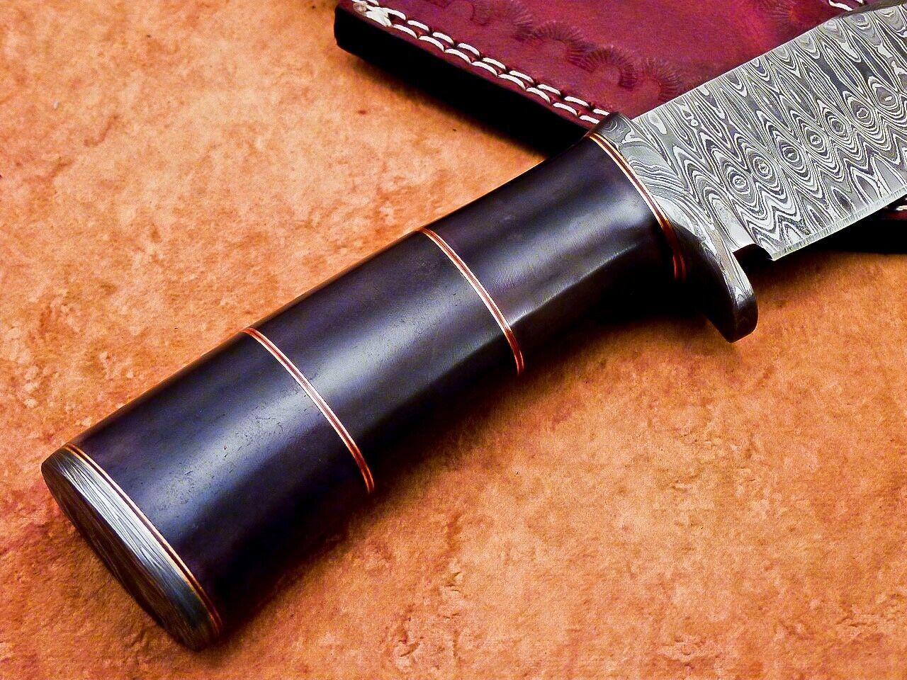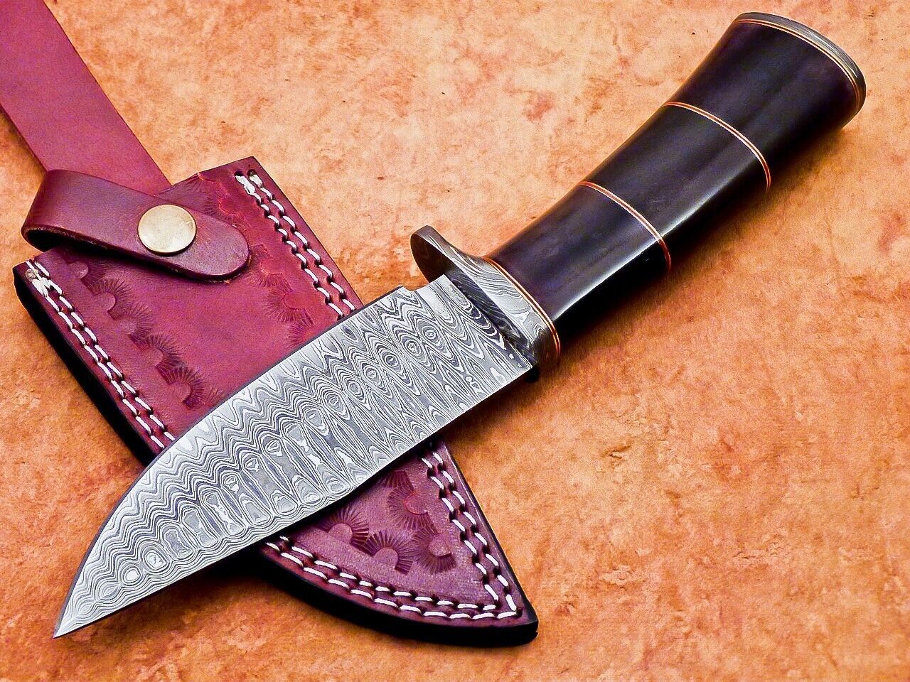Designed for outdoor use and collectors alike, this fixed blade bowie knife features a 5" Damascus steel blade with a finely tapered profile for efficient slicing, skinning, and utility work. The handle is made from stained camel bone, known for its strength, beauty, and natural grip comfort, and complemented by a hand-cast Damascus steel bolster.