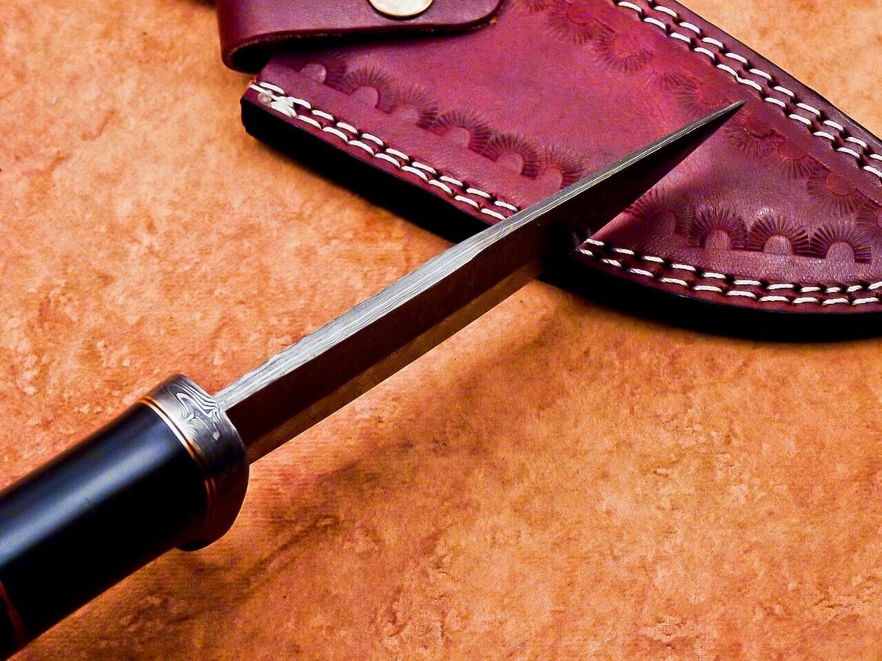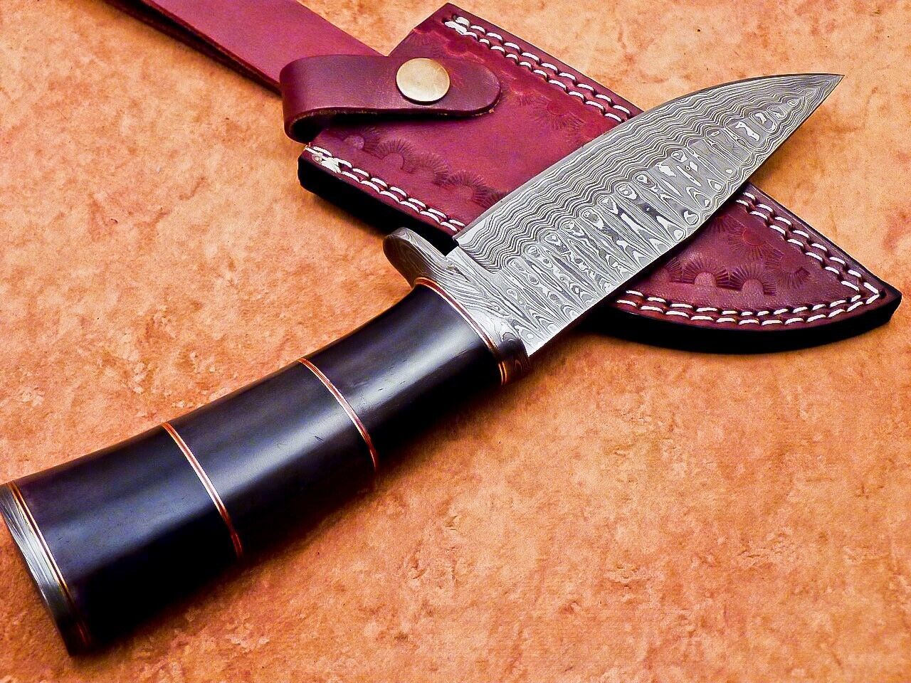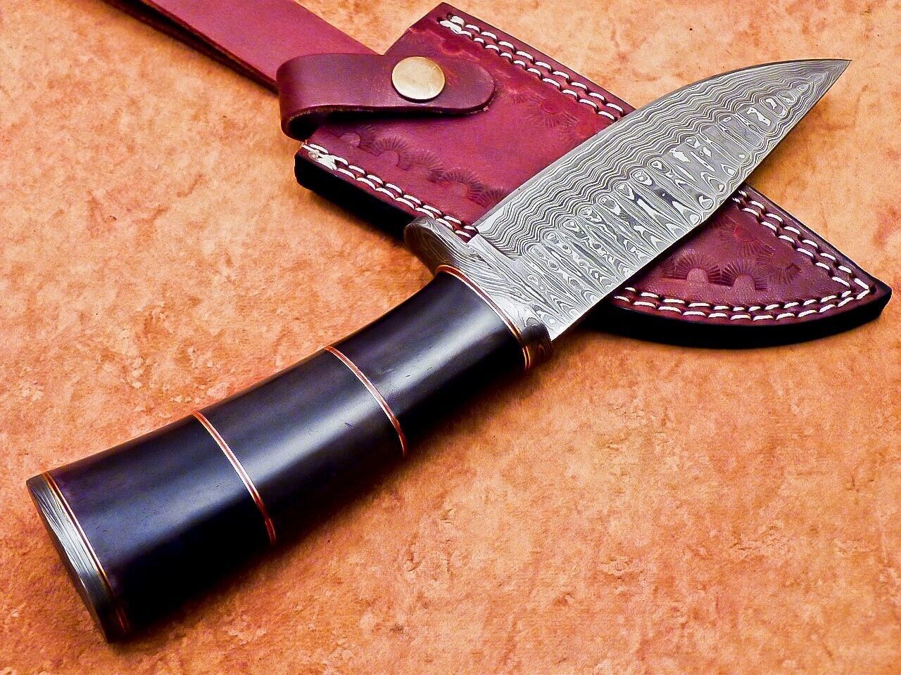 With its full-tang construction and custom-fit leather sheath, this knife is ready for hunting trips, camping adventures, or to be displayed as a centerpiece of your collection. Experience the precision and character of true handmade Damascus steel with Heritage Forge.