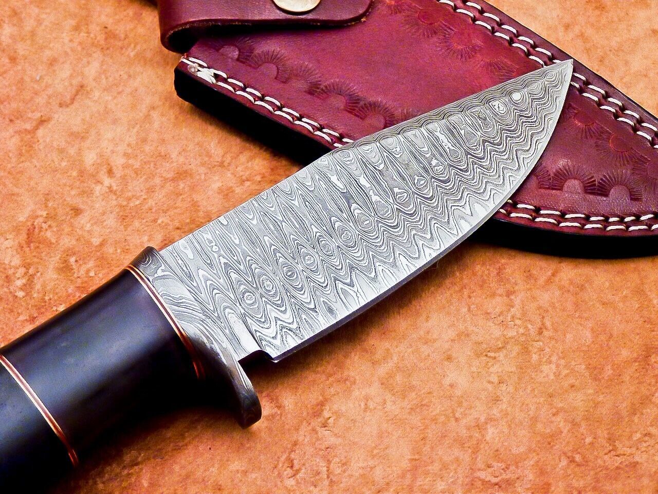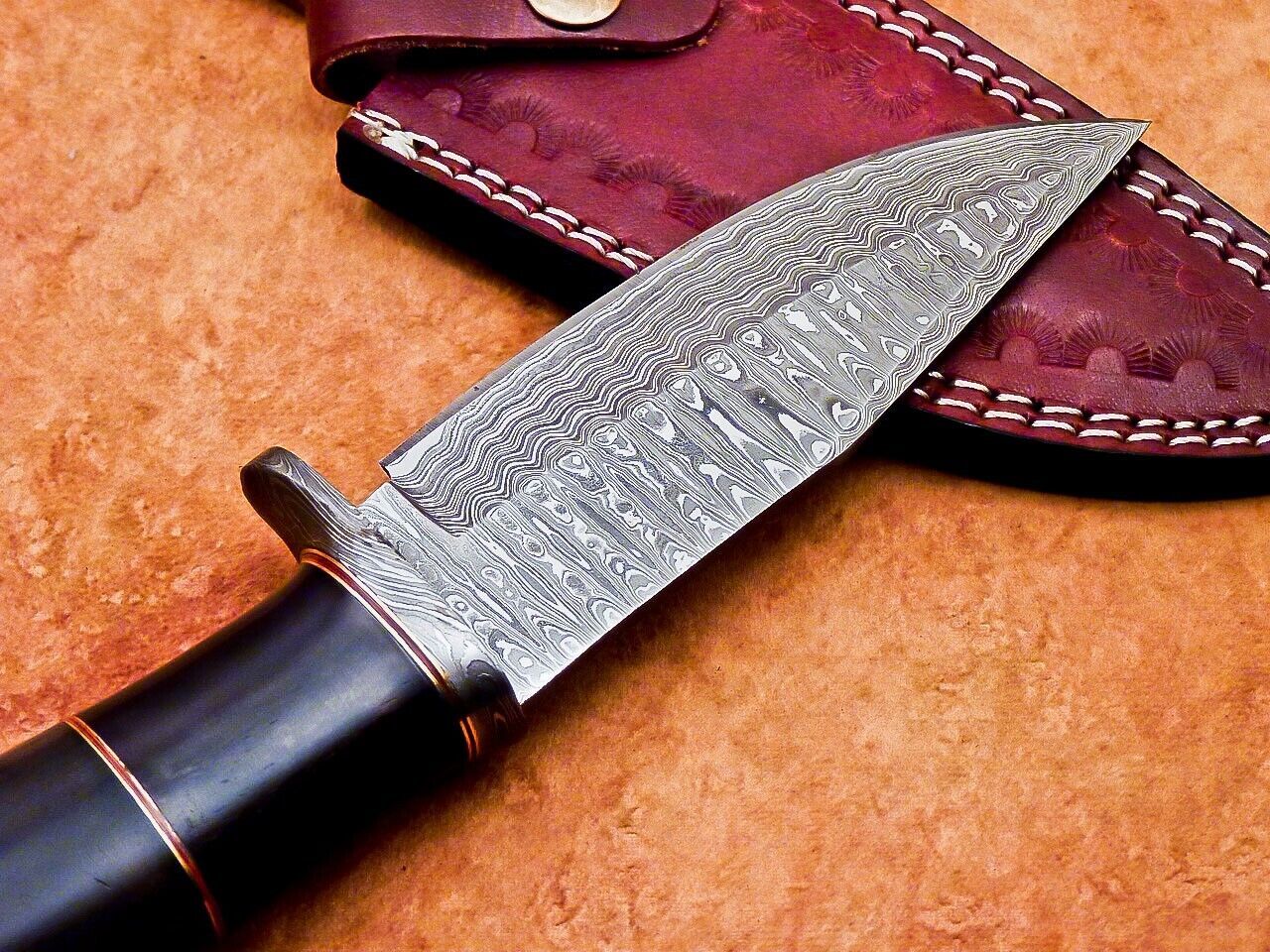 10" Damascus Bowie Hunting Knife – Camel Bone Handle & Leather Sheath