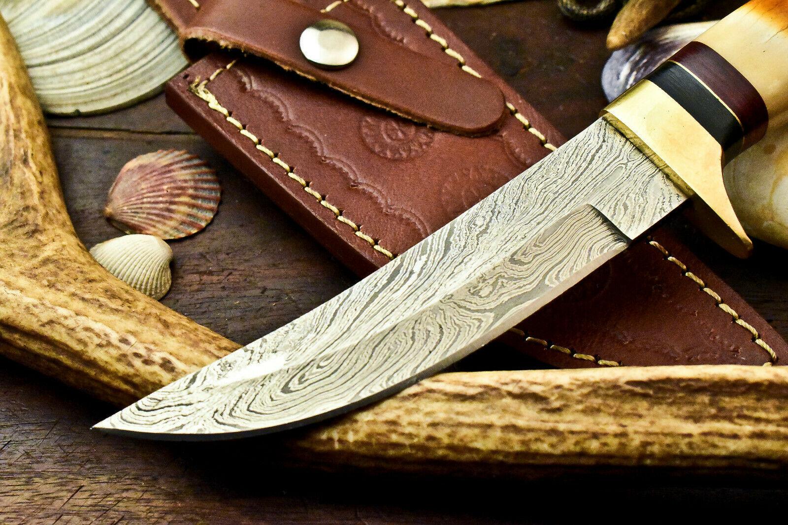10" Damascus Bowie Hunting Knife – Stained Camel Bone Handle with Leather Sheath