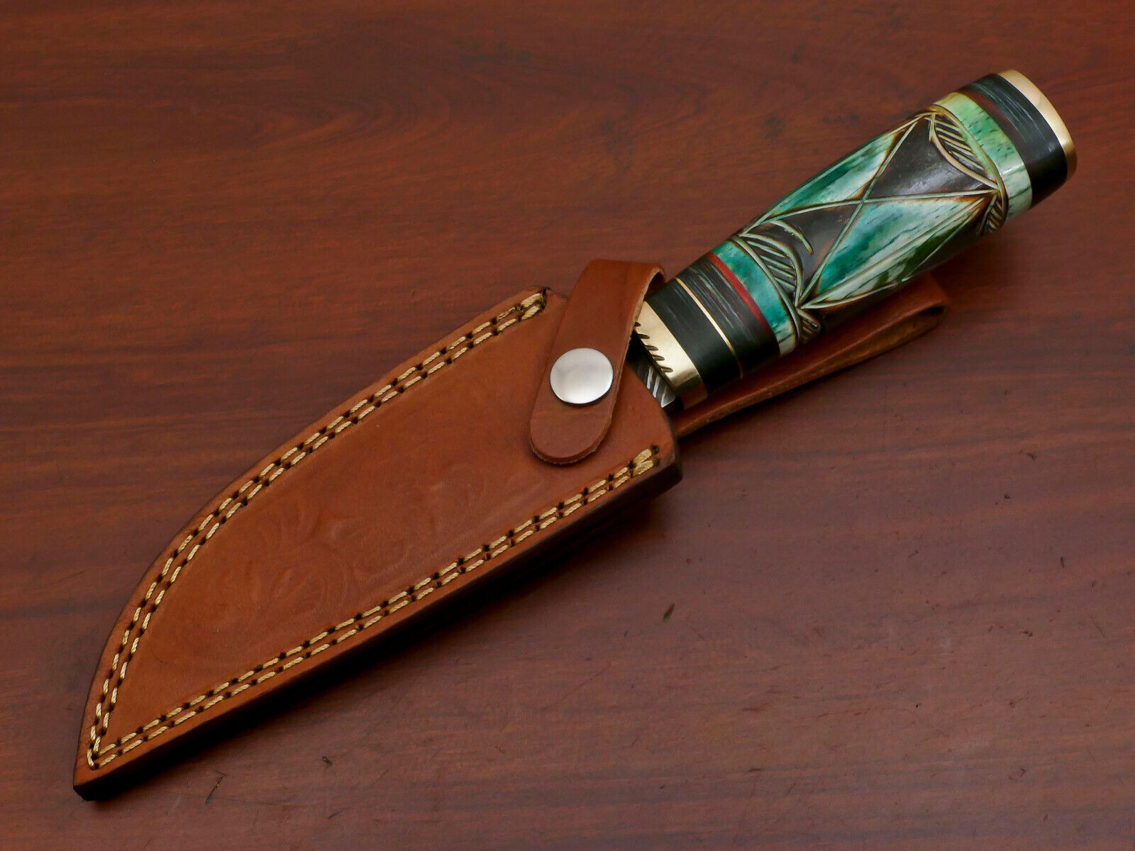 The handle is an exquisite combination of stained, engraved camel bone and pakka wood, ergonomically shaped for a comfortable, secure grip. A hand-casted brass guard and butt cap provide added balance, protection, and classic appeal. This knife is not only a cutting tool—it's a work of functional art.