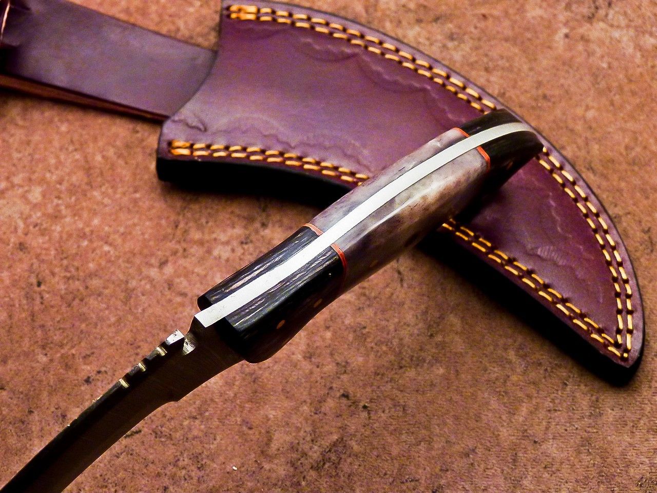 The 5" handle is crafted from high quality wood and Bone, offering an ergonomic and secure grip. Its full tang construction ensures strength, balance, and durability during hunting, survival, or tactical use. Paired with a premium leather sheath, this karambit knife is ready for safe carry and long term use.