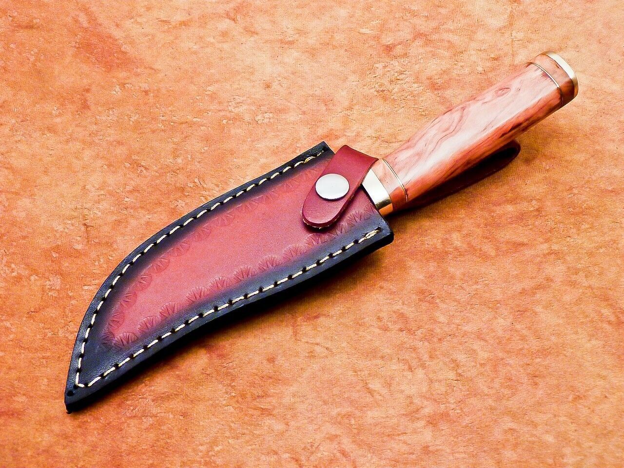 The razor-sharp 5" blade is hardened to a Rockwell rating of 50–54 HRC, ensuring it maintains its edge through demanding tasks. The full tang construction provides superior strength and balance, while the ergonomically shaped olive wood handle adds rustic appeal and comfortable grip. A brass bolster enhances durability and adds a touch of refined craftsmanship.