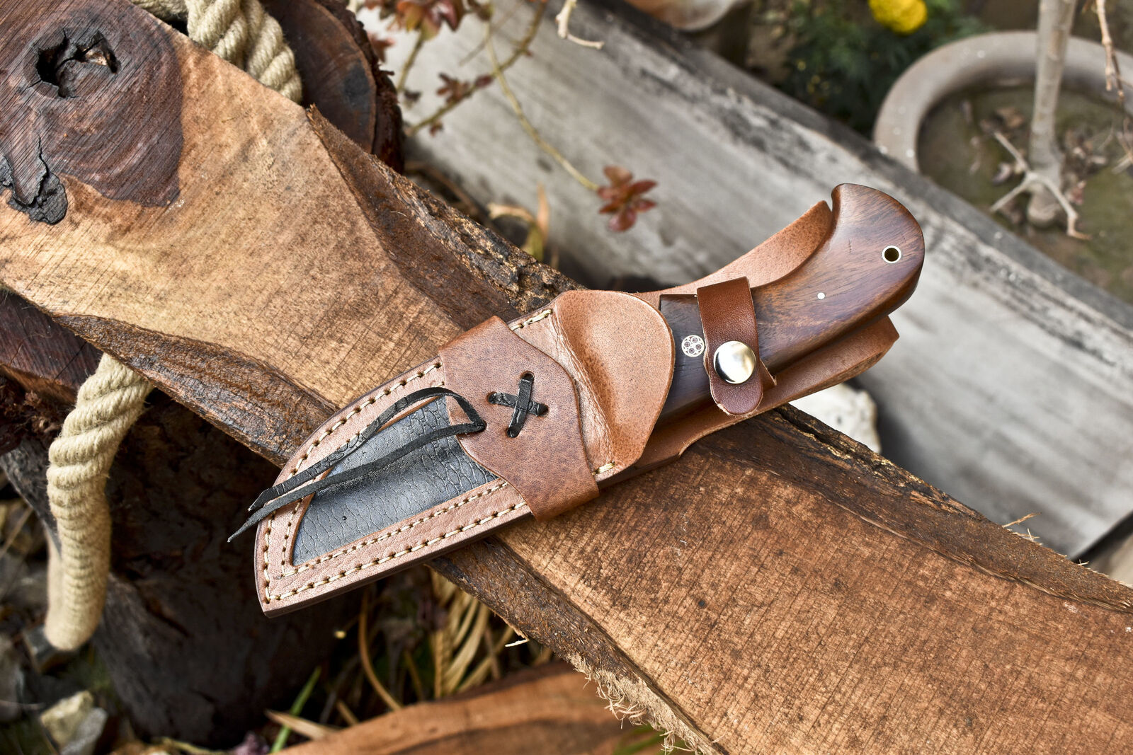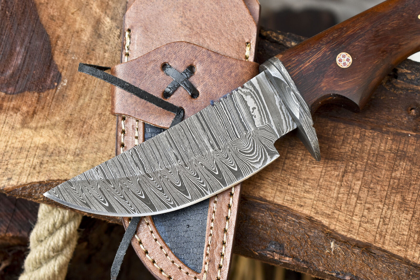 Crafted with a solid walnut wood handle and finished with a hand-forged Damascus guard, this Damascus knife custom handmade fixed blade hunting knife skinner provides exceptional balance and control during detailed skinning tasks. The natural grip of the walnut handle ensures steady handling even in tough outdoor conditions.