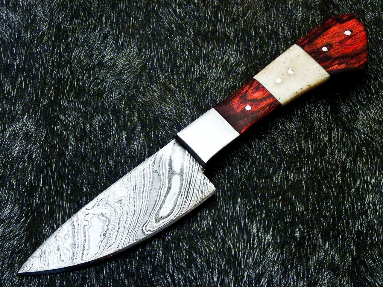 Experience the ultimate in culinary craftsmanship with this custom handmade Damascus Chef Knife. Measuring 10 inches overall, with a 5-inch blade and a 5-inch handle, this knife combines artistry and functionality. The blade is meticulously forged from high-quality Damascus steel, creating 512 layers for a mesmerizing pattern that flows all the way to the edge. Its saw-blade effect at the microscopic level ensures prolonged sharpness, while the 4 mm thick blade offers perfect hand grinds on both sides, with a false edge on top. Expert heat treatment provides a Rockwell hardness of 50–54 along the edge and 42–45 along the spine. The handle is crafted from beautiful camel bone and hard wood, secured with brass pins and strong epoxy for lifetime durability. This knife is ideal for professional chefs and home cooks seeking precision, elegance, and reliability in the kitchen.