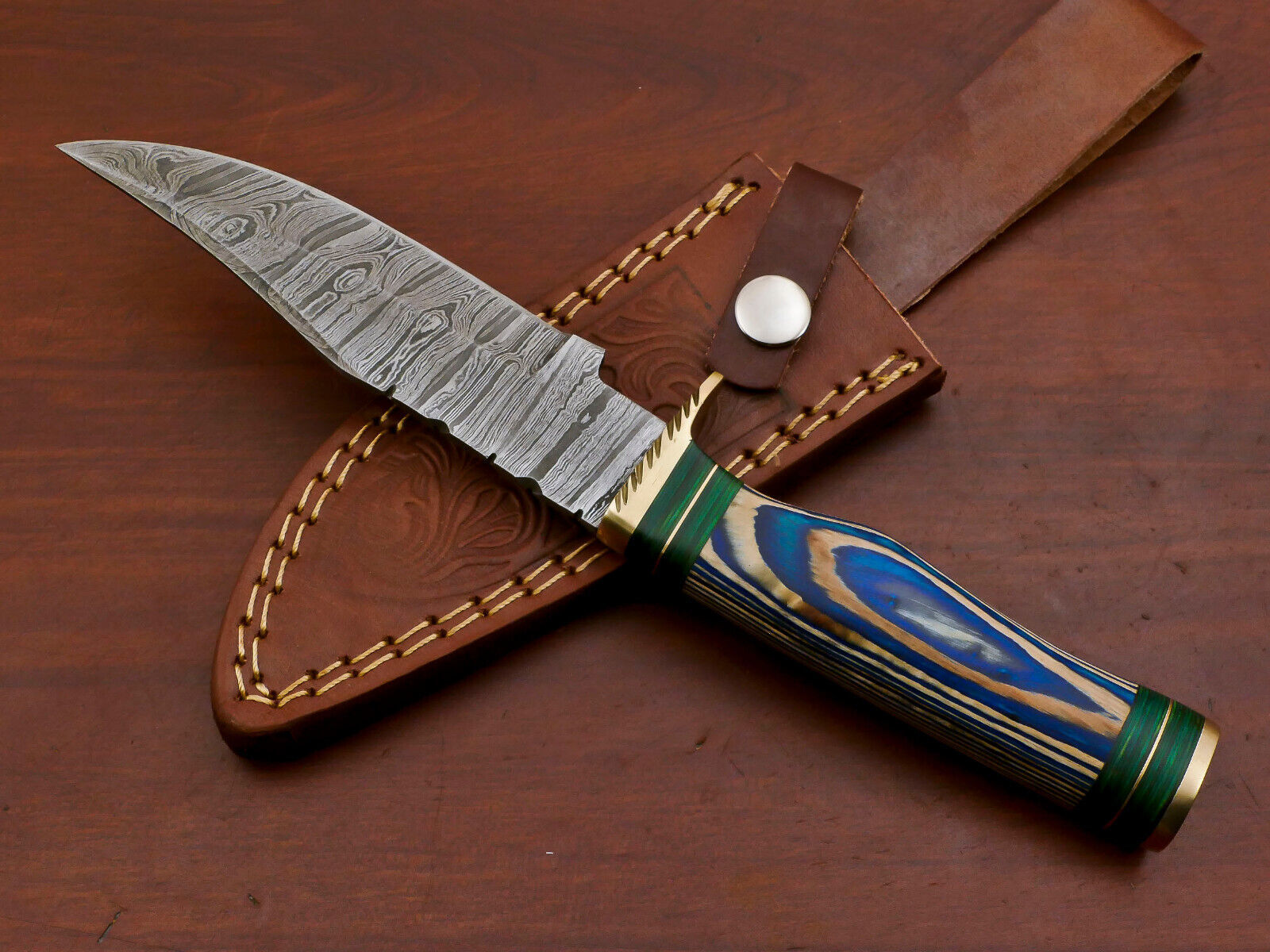 10" Handmade Damascus Steel Bowie Knife with Pakka Wood Handle & Brass Guard