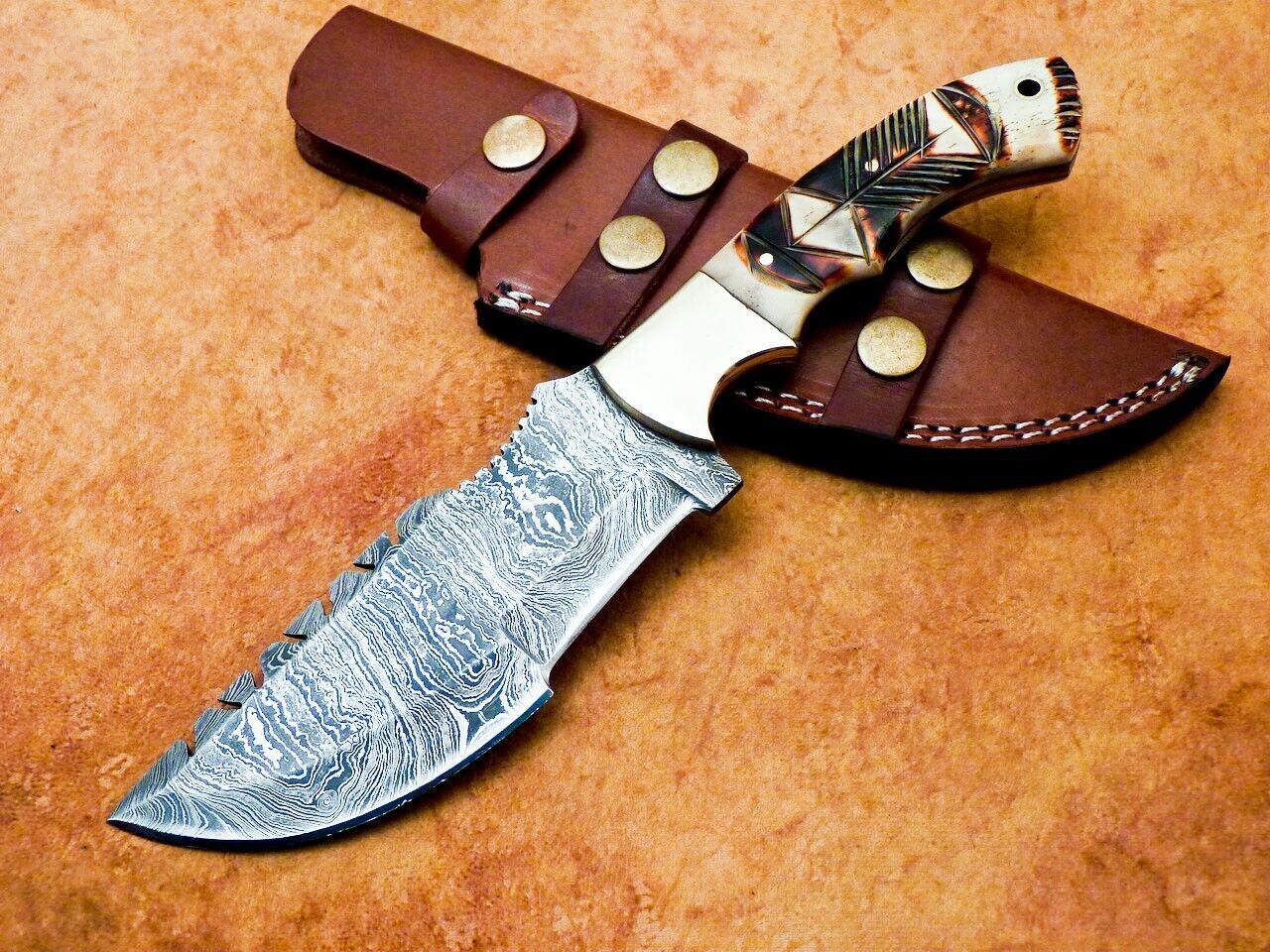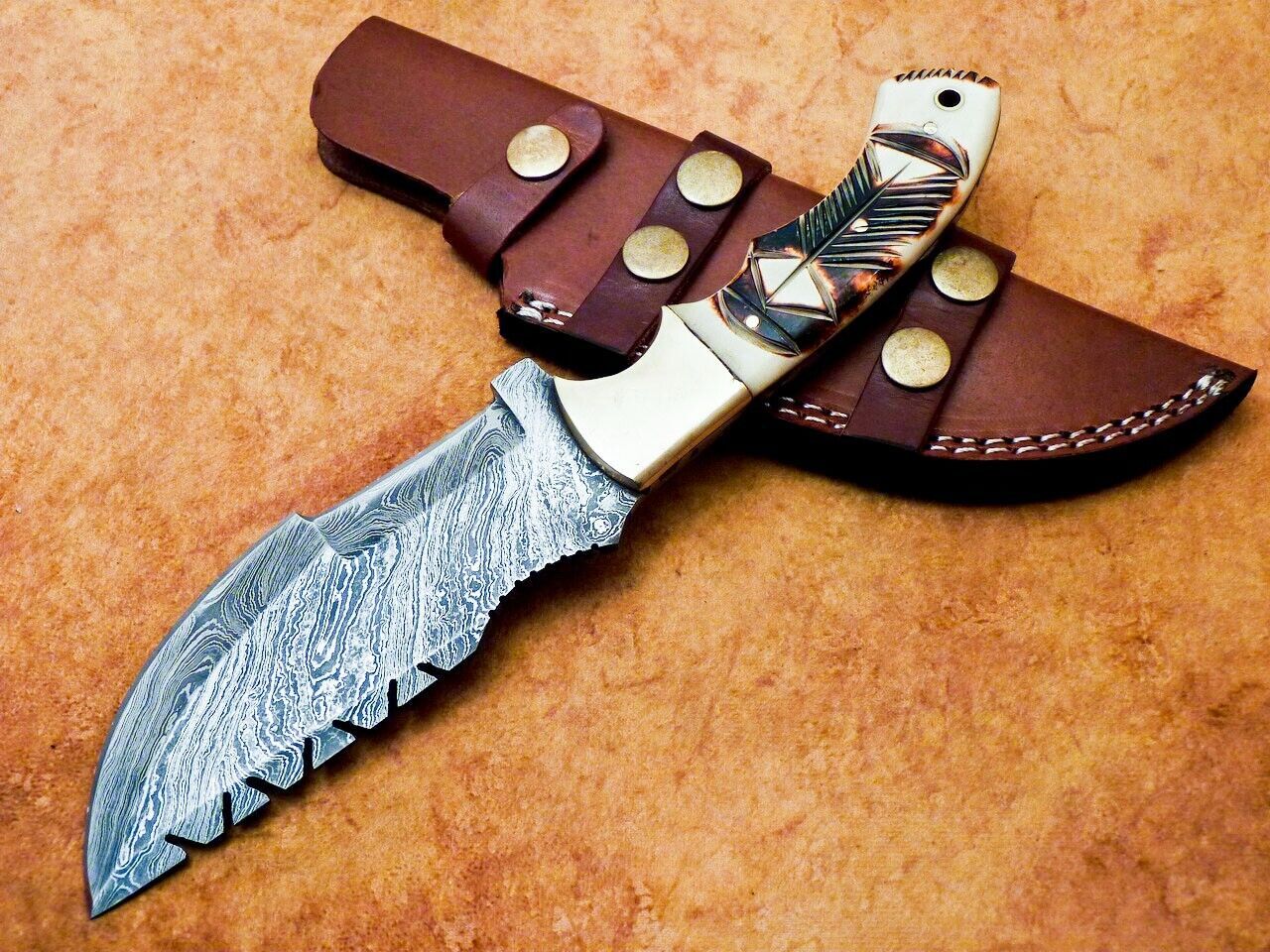10" Handmade Damascus Steel Full Tang Tracker Bowie Knife – Camel Bone Handle w/ Brass Bolster