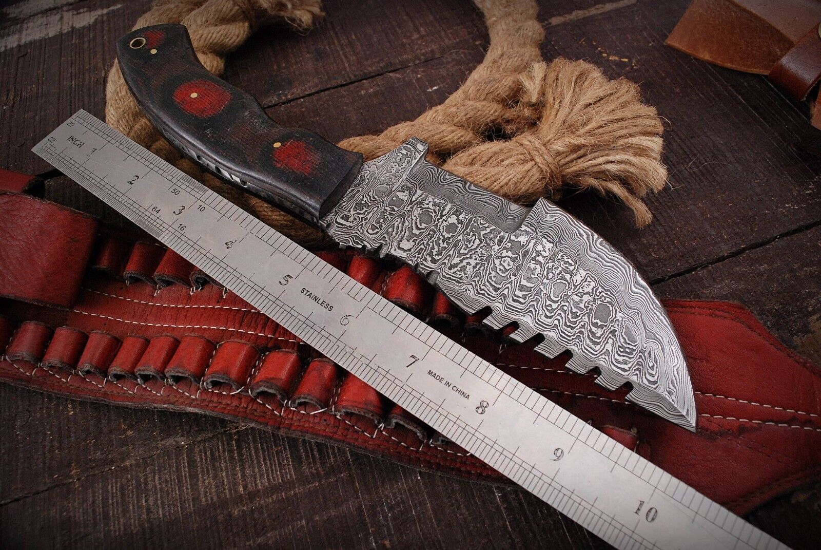 This 10" Handmade Damascus Steel Tracker Knife is a powerful and versatile outdoor tool designed for survival, hunting, camping, bushcraft, fishing, and everyday carry. Expertly crafted with over 352 layers of 15N20 and 1095 high carbon steel, the blade is oil-tempered to a Rockwell hardness of 58–60 HRC, providing superior edge retention, durability, and cutting power. Each blade is 100% hand-forged by skilled artisans, making every knife unique with the distinctive patterns of Damascus steel.The knife measures 10 inches overall, featuring a 5-inch razor-sharp blade and a 5-inch handle made from premium olive wood, designed for comfort, grip, and ambidextrous use. Built with full tang construction, it delivers maximum strength and balance for heavy-duty tasks. The Tracker design makes this knife a true multipurpose tool: the forward curved blade is weighted and beveled for chopping like a small hand axe, while the precision edge is ideal for slicing, skinning, and general camp chores.Complete with a custom-fitted leather sheath, this handmade Damascus tracker knife is easy to carry and safely store. Whether used for outdoor adventures, bushcraft survival, or as a collector’s piece, this knife blends functionality, craftsmanship, and rugged style into one dependable blade.