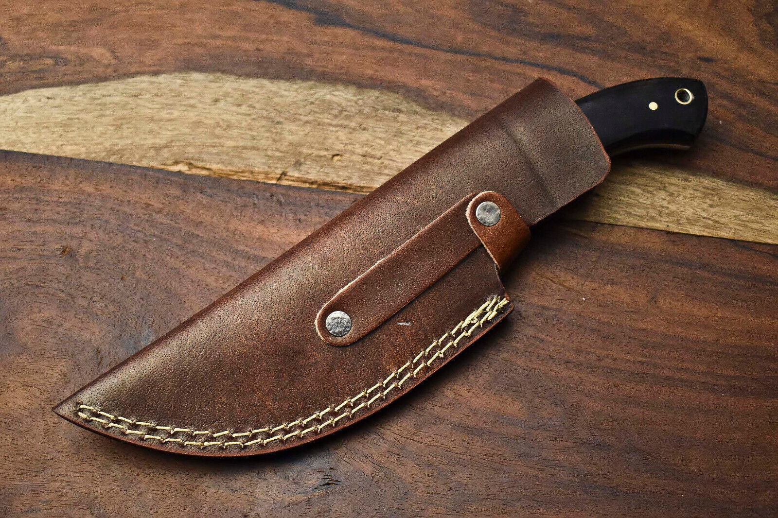 Discover the artistry and strength of this 10-inch handmade Damascus steel tracker knife, crafted with a full tang blade and a durable bull horn handle. Forged from a mixture of 1095 high-carbon steel and 15N20 nickel steel, the blade is folded repeatedly to form 384 unique layers, producing the signature Damascus pattern. Through an acid-etching process, the nickel layers shine satin silver while the carbon steel darkens, creating the bold contrast that makes Damascus steel so striking. Unlike mass-produced blades, this tracker knife is 100% handmade, ensuring every piece is one of a kind.The blade is hand-sharpened to a razor edge, tempered to 58–60 HRC, and polished to a satin finish for long-lasting performance. With its bull horn handle, this knife not only provides a secure, ergonomic grip but also adds a rugged and natural aesthetic. Designed for versatility, it excels at bushcraft survival, hunting, skinning, chopping, and camping tasks, making it an indispensable outdoor companion. Each knife comes with a premium handmade leather sheath for safe storage and carry. Built to last for generations, this Damascus tracker knife is a functional survival tool as well as a collectible piece of artisan craftsmanship.