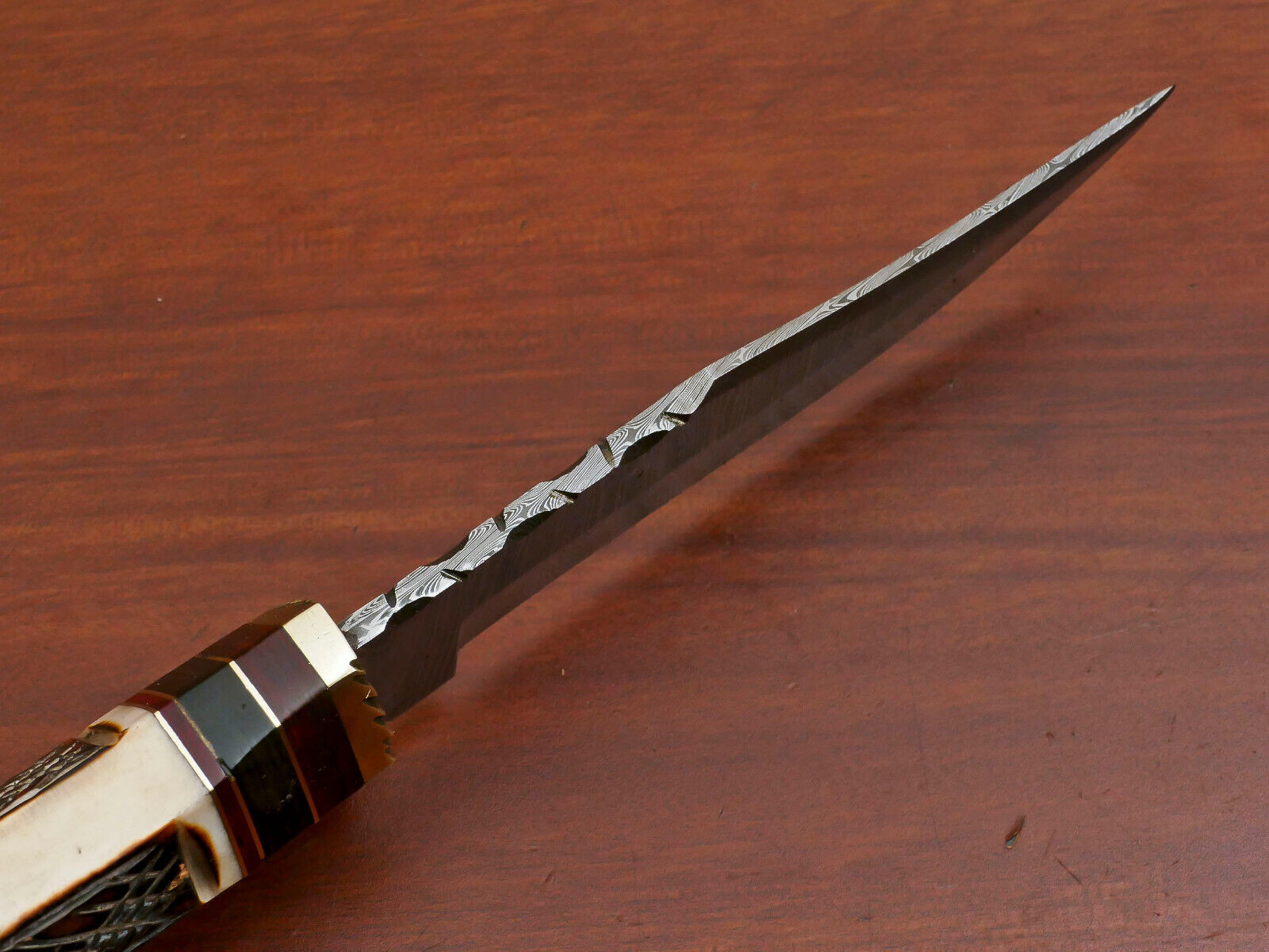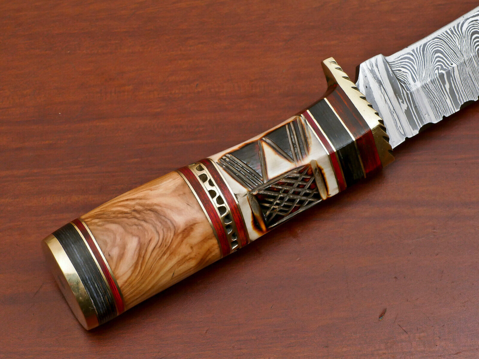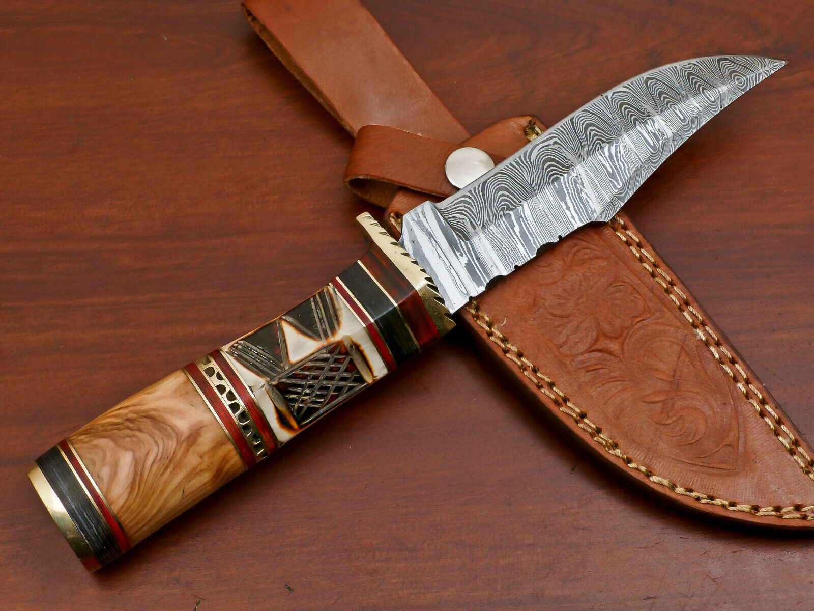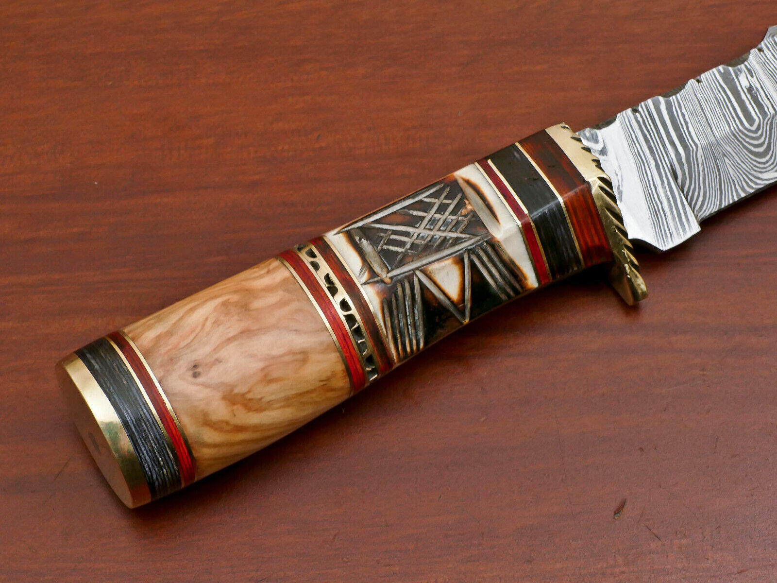 10 Inch Custom Damascus Hunting Knife with Camel Bone Olive and Pakka Wood Handle