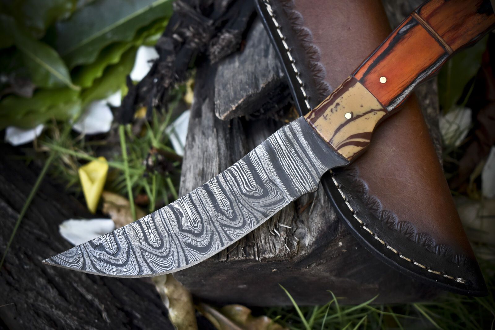 The knife comes with a thick, hand-tooled leather sheath featuring reinforced stitching to withstand rugged use. This handmade skinner Damascus knife combines expert craftsmanship with functional design, making it an ideal gift for hunters or collectors who value quality and aesthetics.