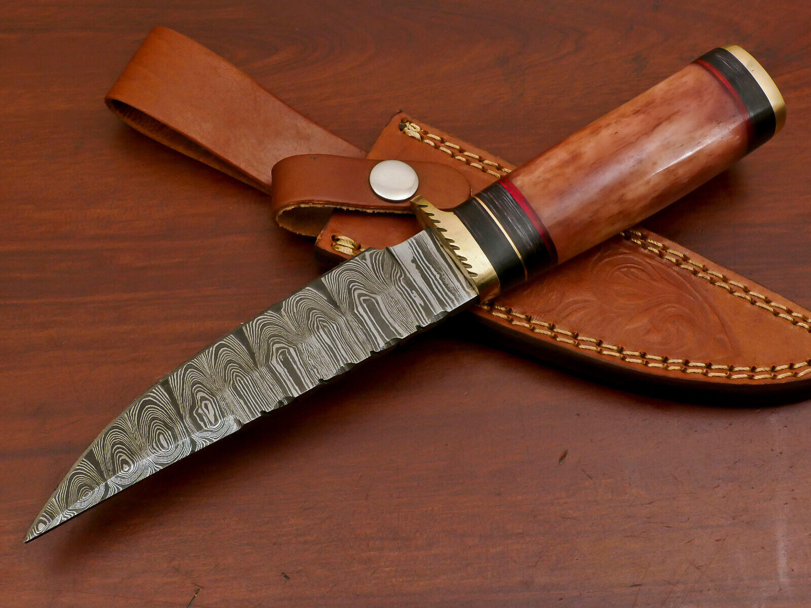 Each knife includes a premium hand-tooled leather sheath, precisely fitted to the blade for secure carrying. Handcrafted in Pakistan, this Damascus hunting knife is a true work of art and a practical companion for your next adventure. No two knives are exactly alike, offering a one-of-a-kind design in every piece.