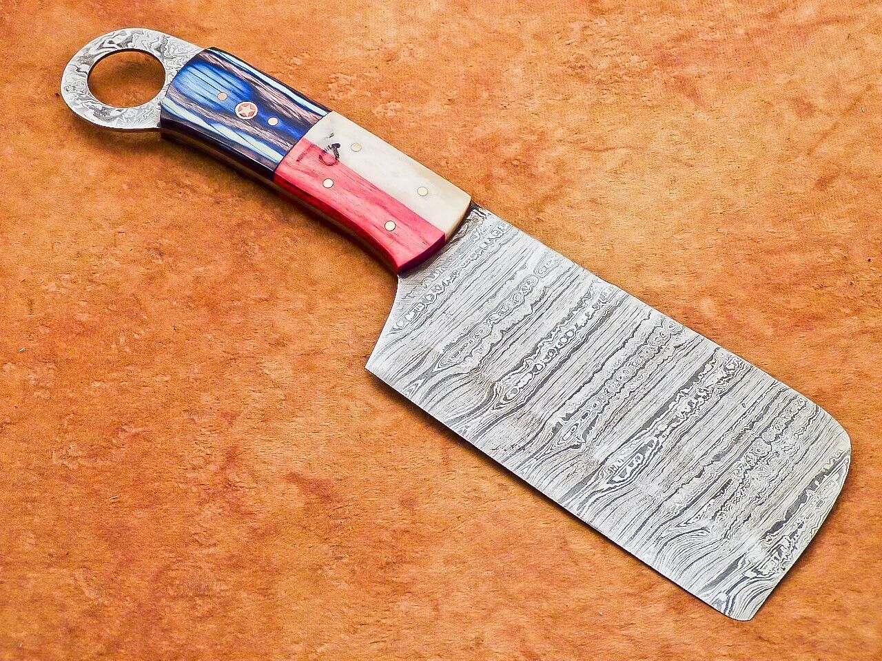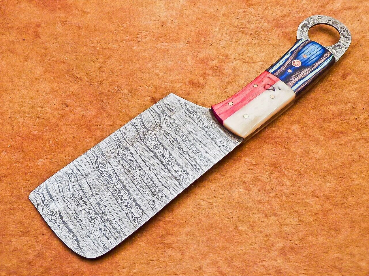 This 10-inch Professional Chef Chopper Knife is a stunning example of custom handmade Damascus steel craftsmanship. Expertly forged by skilled artisans, this cleaver knife combines durability, sharpness, and beauty in one exceptional tool. With an overall length of approximately 10 inches, it features a 5-inch razor-sharp Damascus blade and a 5-inch handle made from beautiful camel bone, offering both comfort and elegance. The Damascus blade is crafted from 1095 and 15N20 high carbon steel, layered 512 times to create its unique flowing pattern that extends all the way to the edge. Forged through hours of skilled work, the blade is oil tempered to a Rockwell hardness of 50–54 along the edge and 42–45 along the spine, ensuring excellent cutting performance and long-lasting durability. The 4 mm thick blade has fine hand grinds on both sides, with the top side finished with a false edge for a striking appearance. Designed for professional chefs and kitchen enthusiasts alike, this knife delivers unmatched precision and strength, making it perfect for chopping, slicing, and preparing meals with ease.