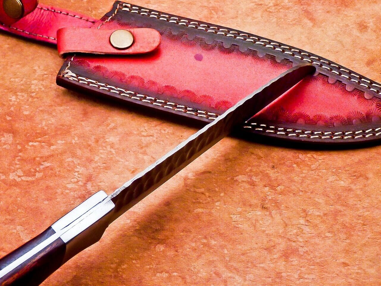 This 10-inch Professional Handmade Damascus Steel Chef Knife is a premium kitchen essential designed for chefs, home cooks, and collectors who value precision and craftsmanship. Measuring 10 inches in total, it features a 5-inch razor-sharp Damascus steel blade and a 5-inch handle crafted from beautiful hard wood, reinforced with brass pins and a handmade steel bolster for strength and lifetime durability. Complete with a leather sheath for safe storage, this knife is both functional and elegant. Expertly hand forged from 1095 and 15N20 high carbon steel, the blade is made of 512 true layers, forming a striking Damascus pattern that flows to the cutting edge. At 4 mm thick, the blade offers excellent balance and strength, with fine hand grinds on both sides and a sleek false edge on the top. Heat-treated for superior performance, the Rockwell hardness measures 50–54 HRC along the edge for razor-sharp cutting ability and 42–45 HRC along the spine for added toughness and flexibility. The unique Damascus layering creates a microscopic saw-blade effect, ensuring the edge stays sharper longer than ordinary blades. Each knife is 100% handmade, making it a one-of-a-kind piece of art as well as a reliable kitchen companion.