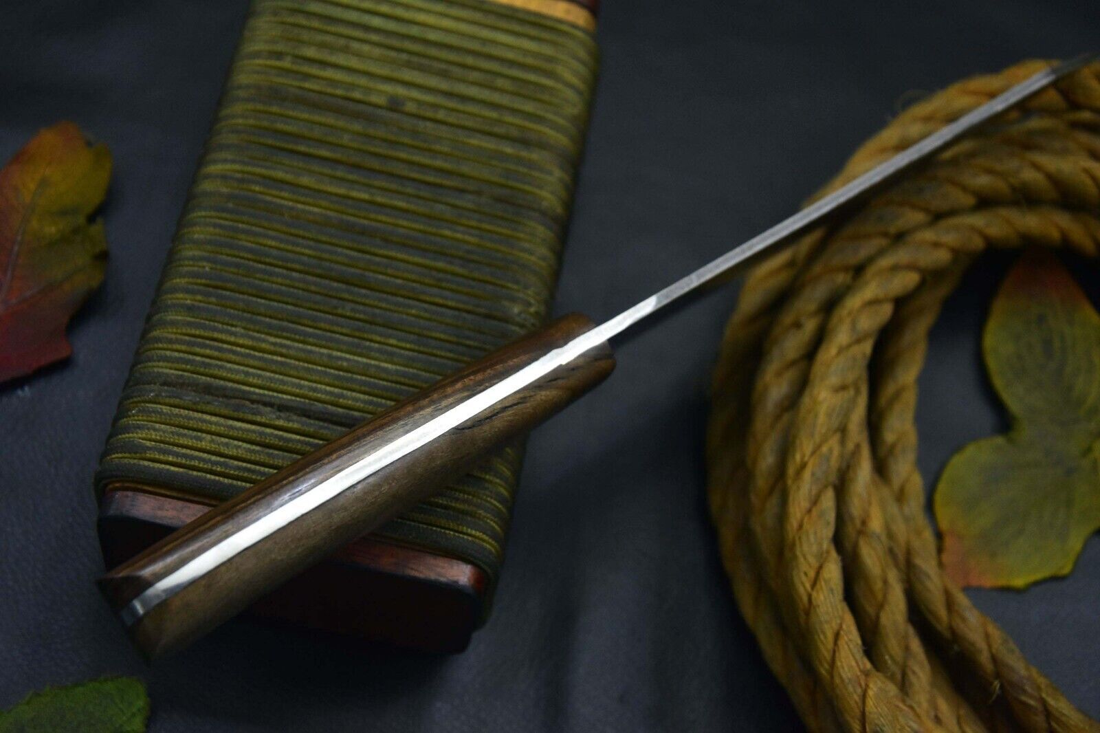 This custom San Mai Damascus steel chef knife is a stunning blend of craftsmanship and performance. Hand forged with precision, it features a 7.0-inch blade crafted from 512 layers of 1095 and 15N20 high carbon steel in a striking ladder pattern. The walnut wood handle, measuring 4.40 inches, ensures a comfortable and secure grip, while the blade thickness of 2.40 mm and Rockwell hardness of 58–60 HRC deliver exceptional sharpness and durability. With an overall length of 11.40 inches and a blade width of 1.50 inches, this chef knife is perfectly balanced for professional chefs and home cooks alike. Each knife undergoes rigorous testing under intense conditions to guarantee long-lasting reliability and cutting performance. Ideal for precise slicing, chopping, and dicing, it also makes a unique and thoughtful gift for culinary enthusiasts.