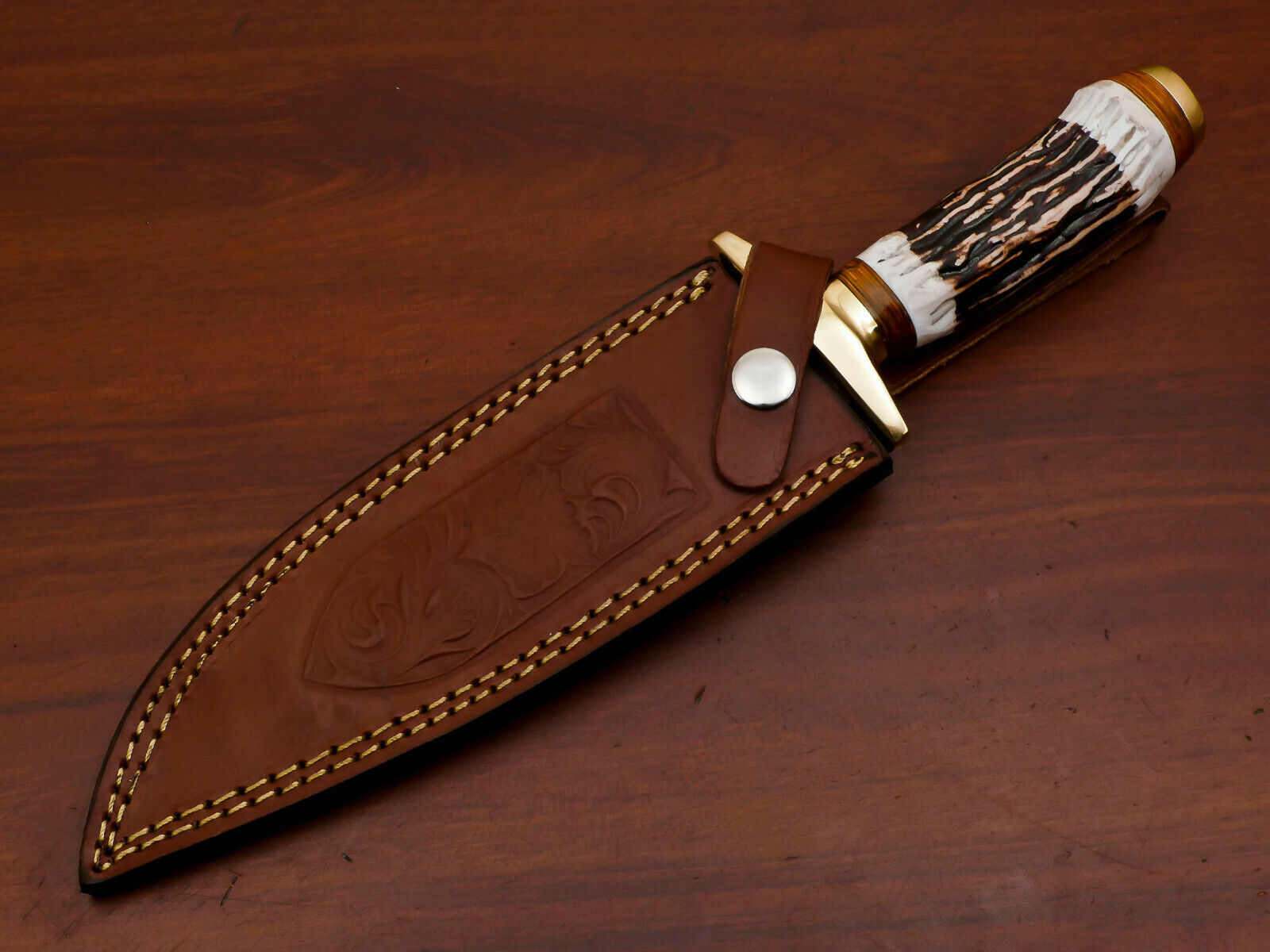 11.5 Inch Handmade Damascus Steel Bowie Knife with Stag and Pakka Wood Handle