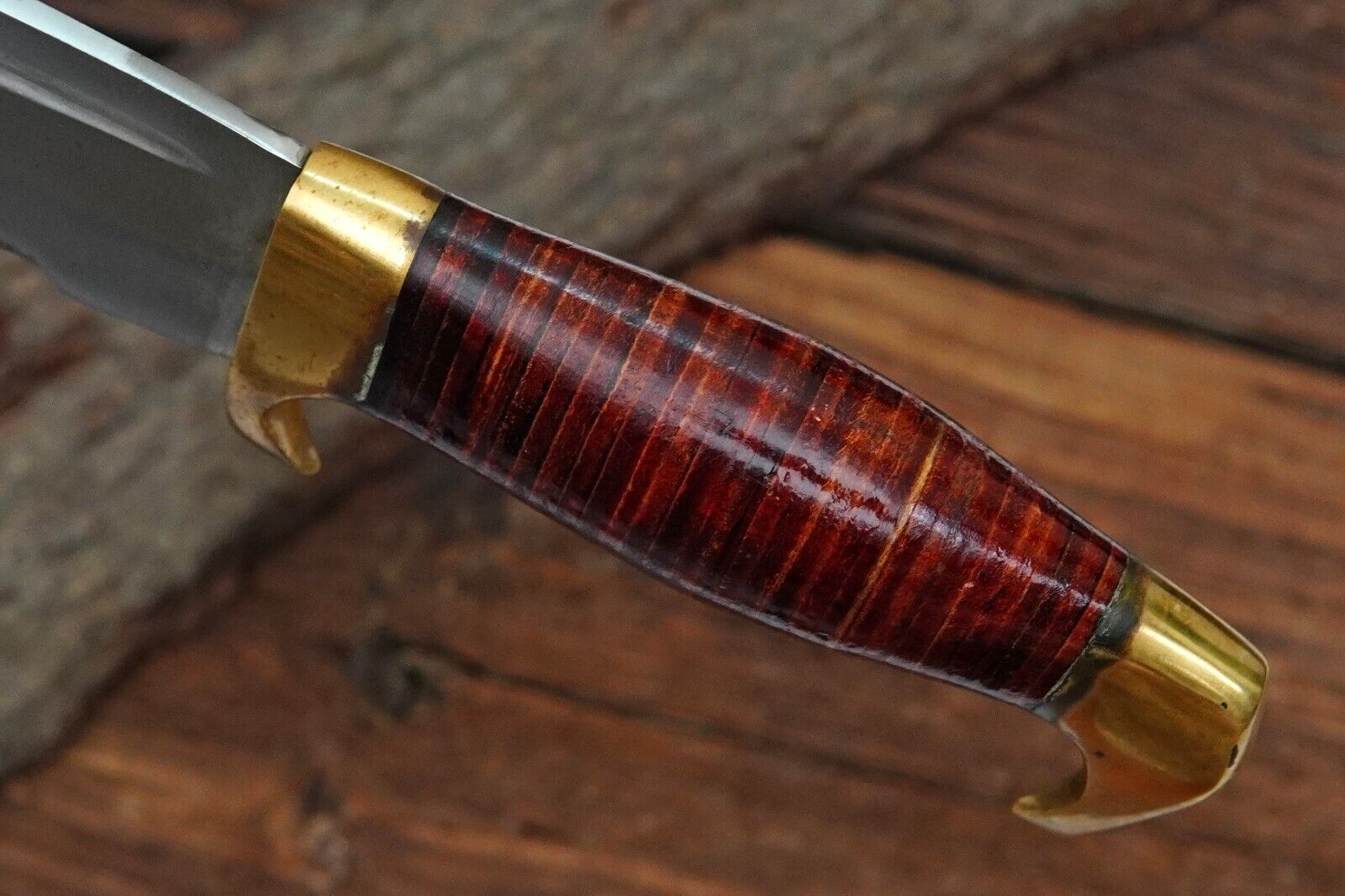 The 4.5 inch handle is shaped for a comfortable, secure grip and may vary in material depending on the handcrafted batch—each piece remains unique in beauty and balance. Crafted with precision and designed for performance, this knife ensures durability in harsh outdoor conditions. Its full-length construction and perfectly balanced weight make it ideal for long-term field use.