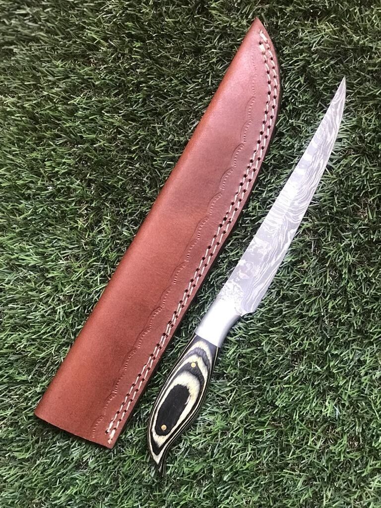 This 11" Custom Handmade Twist Damascus Steel Fillet Brisket Hunting Knife is a premium quality damascus fillet knife crafted for precision cutting and professional performance. Whether you need a damascus steel fillet knife for kitchen use, a damascus fishing knife for outdoor trips, or a reliable damascus filleting knife for fish processing, this blade is designed to perform. Its versatile design allows it to function perfectly as a damascus fish knife, brisket slicer, and hunting blade. Built with traditional craftsmanship, this knife stands among the best fillet knife options available for both professionals and collectors seeking a good fillet knife. Each knife is individually forged, making it one of the finest handmade fillet knives available on the market.