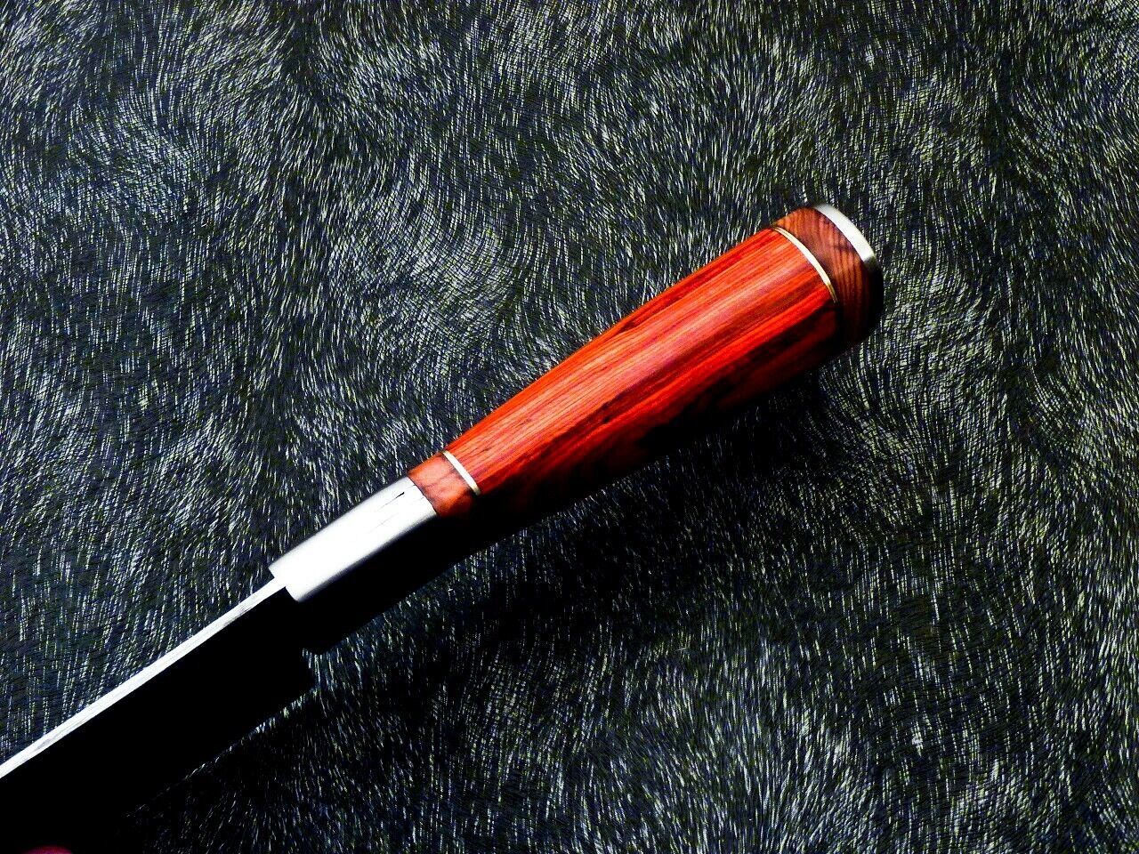 This 11" custom hand-forged Damascus steel chef knife is a stunning blend of craftsmanship. Measuring approximately 11 inches in total length, with a 6-inch blade and a 5-inch handle, this knife is perfectly balanced for professional and home kitchen tasks. The blade is forged from high-quality 1095 and 15N20 high carbon steel, folded into 512 true layers, creating a beautiful and functional Damascus pattern. With a Rockwell hardness of 50–54 along the edge and 42–45 on the spine, the knife maintains excellent sharpness and durability. The blade’s 4 mm thickness and hand-ground edge ensure exceptional cutting performance, with a microscopic saw-like effect that keeps the edge sharper for longer. The handle is crafted from beautiful hard wood and fitted with a handmade steel bolster for enhanced strength and control. This knife is not just a culinary tool but a work of art, ideal for slicing, dicing, chopping, and more. Whether for everyday kitchen use, outdoor camping, or hunting purposes, this versatile knife delivers precision and reliability. Offered by HM Knives, this masterpiece does not include a sheath and is custom-made to elevate your culinary experience. For bulk or custom orders, feel free to contact us directly.