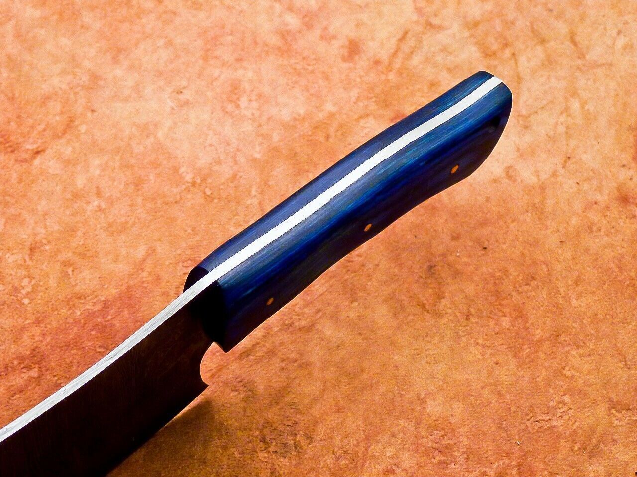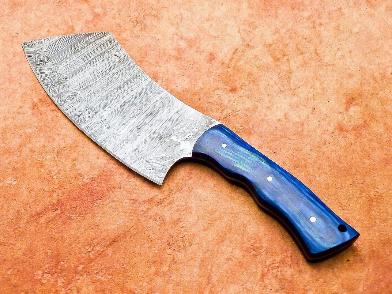 This 11-inch Professional Handmade Damascus Steel Chopper Cleaver Knife is a true masterpiece of craftsmanship, designed for chefs, home cooks, and collectors alike. With an overall length of 11 inches, it features a 6-inch razor-sharp Damascus blade and a 5-inch hardwood handle that ensures comfort and durability during heavy-duty use. Hand forged from 1095 and 15N20 high carbon steel, the blade boasts 512 layers with a striking Damascus pattern that extends seamlessly to the cutting edge. At 4 mm thick, the blade is heat-treated for superior performance, achieving a Rockwell hardness of 50–54 HRC on the edge and 42–45 HRC along the spine. This combination provides excellent edge retention, toughness, and a microscopic saw-blade effect that keeps the knife cutting long after other blades have dulled. Expert hand grinding and a stylish false edge make this cleaver both functional and visually stunning. Each knife is 100% handmade, making every piece unique. Please note: this knife is sold without a leather sheath.