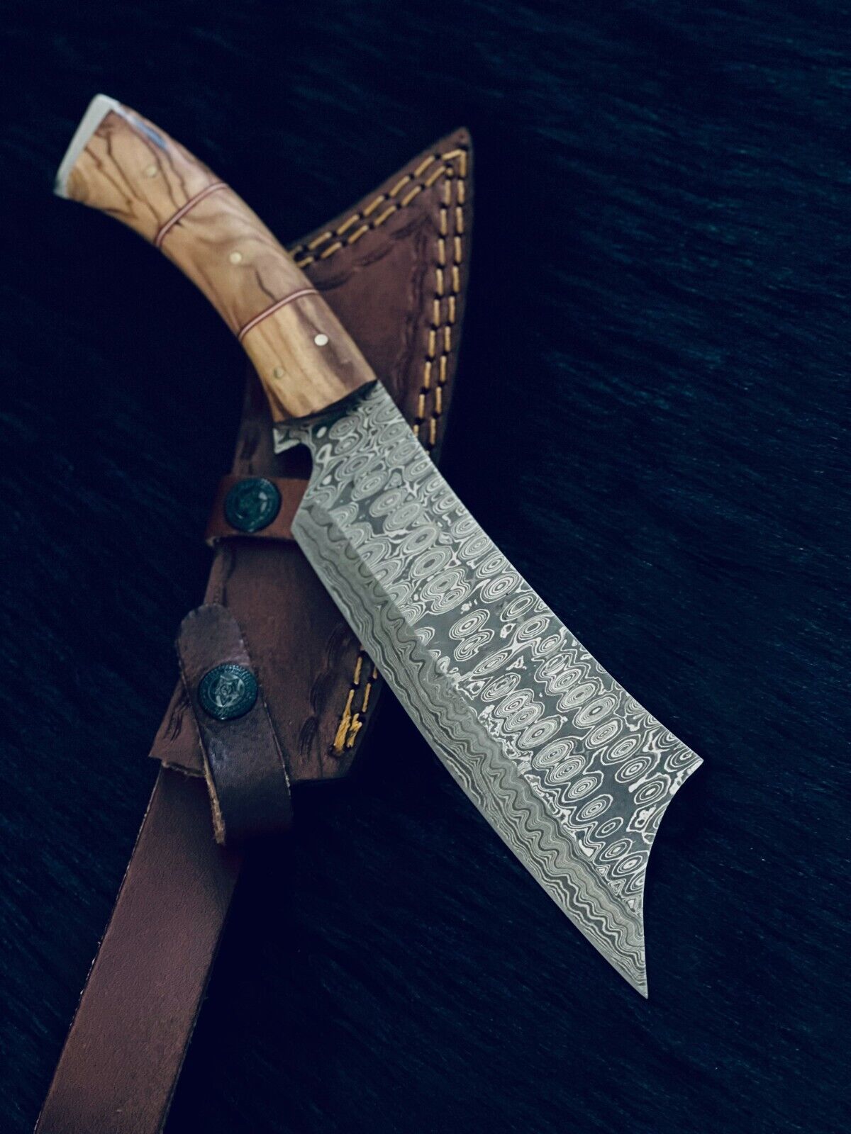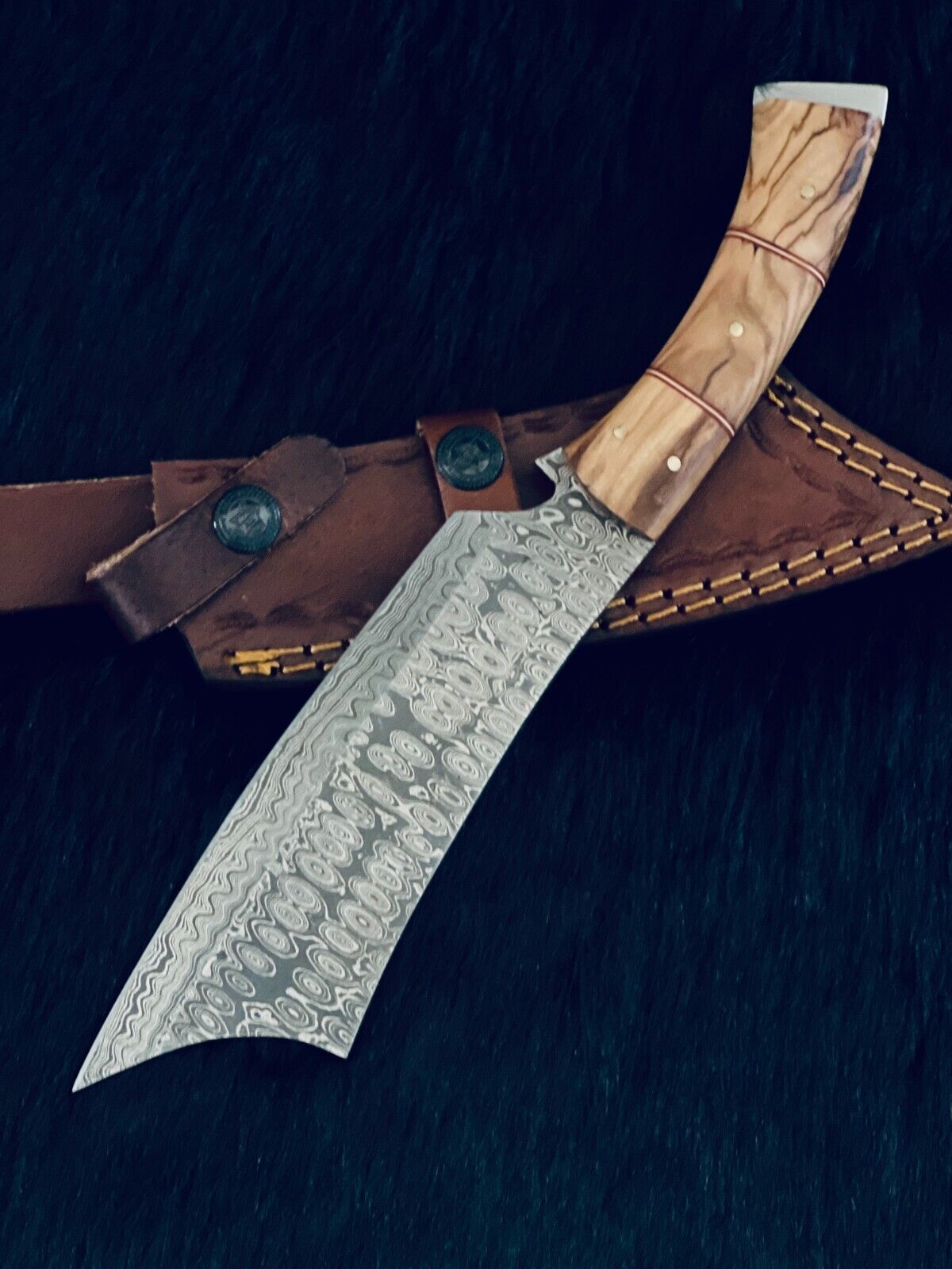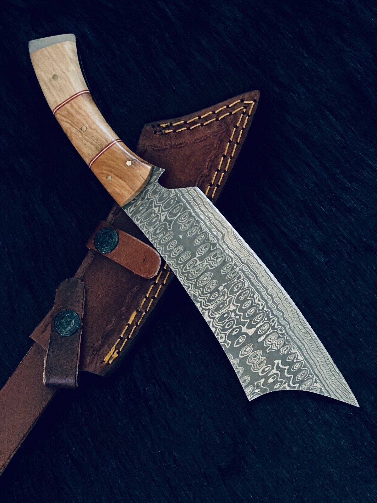 Experience unmatched craftsmanship with the Heritage Forge 11" Custom Handmade Rain Drop Damascus Matchate Bowie Knife. This knife features a hand-forged Damascus steel blade, expertly crafted from premium 1095 high carbon and 15N20 nickel steel, folded into 512 layers to create the distinctive Rain Drop pattern that flows seamlessly to the cutting edge. The full tang design ensures maximum strength, balance, and durability, making it an ideal companion for hunting, camping, and outdoor survival. With a 4 mm thick blade, this knife has been meticulously heat-treated to achieve a Rockwell hardness of 54, providing long-lasting sharpness and cutting precision. The handle is made from stained camel bone and natural wood with brass spacers, offering a comfortable and secure grip while showcasing the knife’s elegant artistry. A handmade Damascus steel bolster further enhances structural integrity and aesthetic appeal. Each knife is 100% handmade, reflecting hours of skilled labor and making every piece a unique work of art. Perfect for collectors, outdoor enthusiasts, or as a remarkable gift, this custom Damascus Matchate Bowie knife combines superior functionality with visual elegance. Heritage Forge ensures every knife is not only a reliable tool but also a lasting collector’s masterpiece.