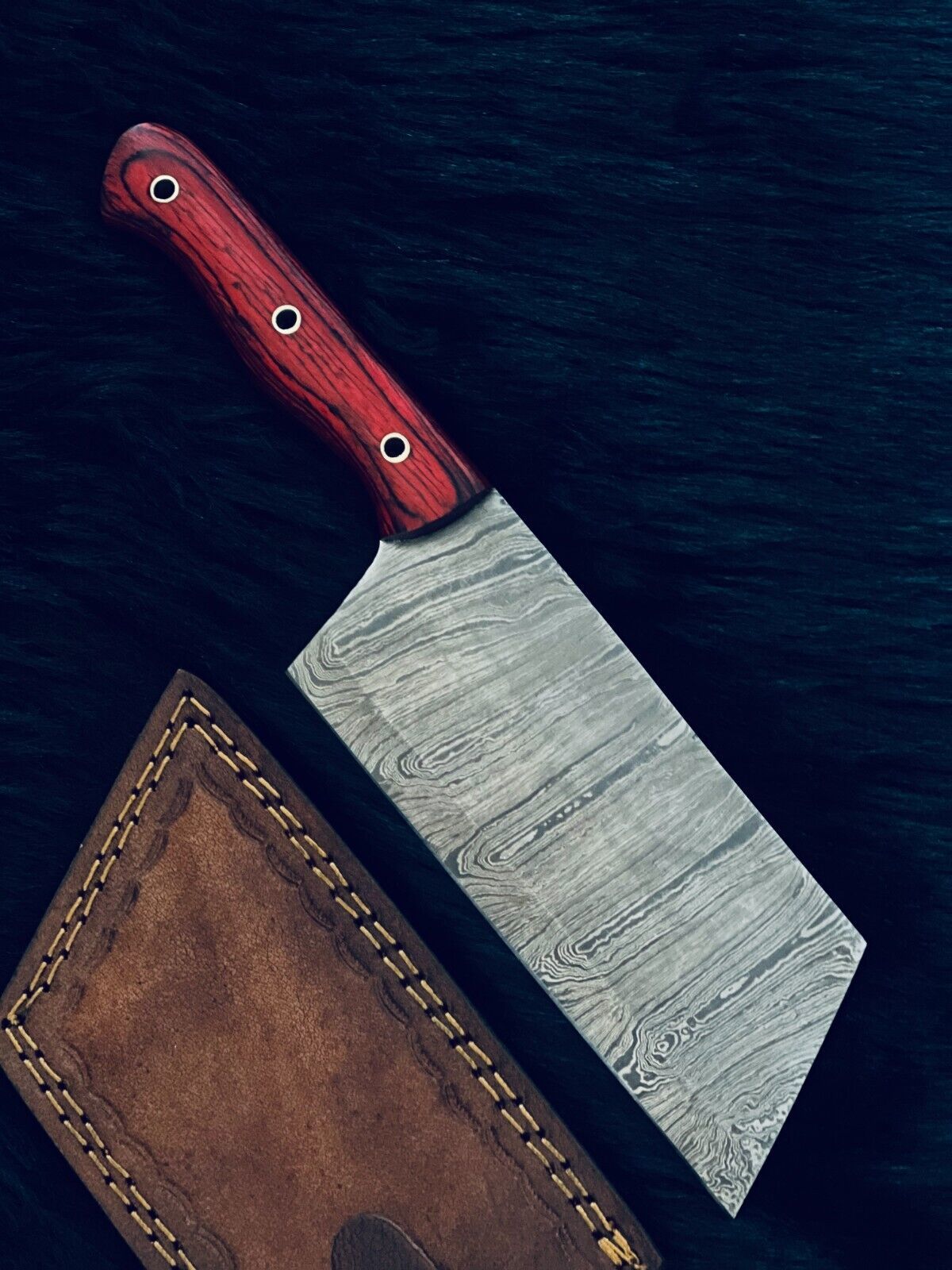 Introducing the Heritage Forge 11" Custom Handmade Twist Damascus Cleaver Hunting Knife, a masterfully crafted knife designed for strength, precision, and style. This knife features a hand-forged Damascus steel blade made from premium 1095 high carbon and 15N20 nickel steel, layered into 512 true folds, forming a unique twist pattern that runs seamlessly from spine to edge. The full tang construction ensures unmatched strength, balance, and durability, making it ideal for hunting, camping, and outdoor chopping tasks. The 4 mm thick blade is meticulously heat-treated, achieving a Rockwell hardness of 54 at the edge, delivering excellent cutting performance and long-lasting sharpness. Its stained camel bone and natural wood handle, accented with brass spacers and a handmade Damascus steel bolster, offers a secure, ergonomic grip while highlighting the knife’s intricate craftsmanship. Each knife is 100% handmade, making every piece unique and reflecting hours of skilled artistry. Perfect for collectors, outdoorsmen, or as a remarkable gift, this custom Damascus cleaver hunting knife combines practicality with visual elegance. Heritage Forge guarantees a knife that not only performs flawlessly but also stands out as a functional work of art, embodying strength, precision, and timeless design.