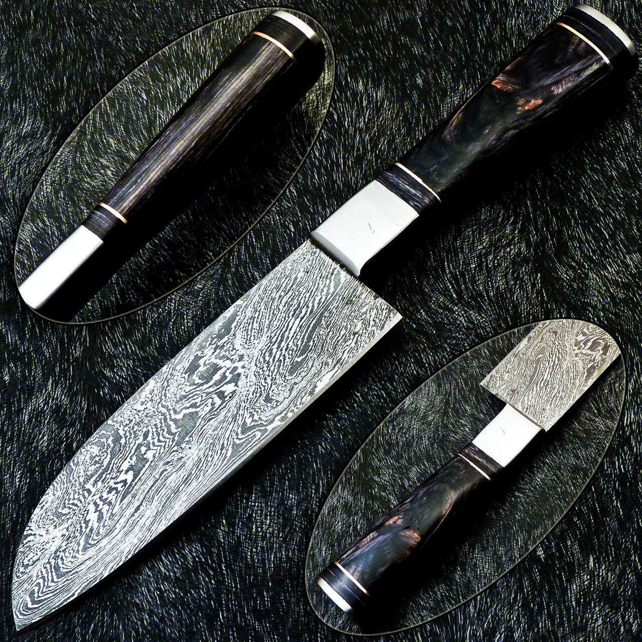 This 11-inch Custom Hand Forged Damascus Steel Chef Knife is a true work of art, combining elegance with exceptional functionality. Handmade with meticulous attention to detail, it features a 6-inch razor-sharp Damascus blade forged from 512 layers of 1095 and 15N20 high carbon steel. The beautiful pattern reflects hours of expert craftsmanship, providing both stunning aesthetics and superior cutting performance. The 5-inch handle is crafted from premium hardwood with brass spacers and a handmade steel bolster, ensuring a comfortable grip, strength, and long-lasting durability. With a 4 mm thick blade and excellent heat treatment, this knife achieves a Rockwell hardness of 50–54 at the edge and 42–45 along the spine, delivering reliable sharpness and resilience. Perfect for chefs, home cooks, and collectors, this knife is not just a kitchen tool but an heirloom-quality piece designed to stand the test of time.