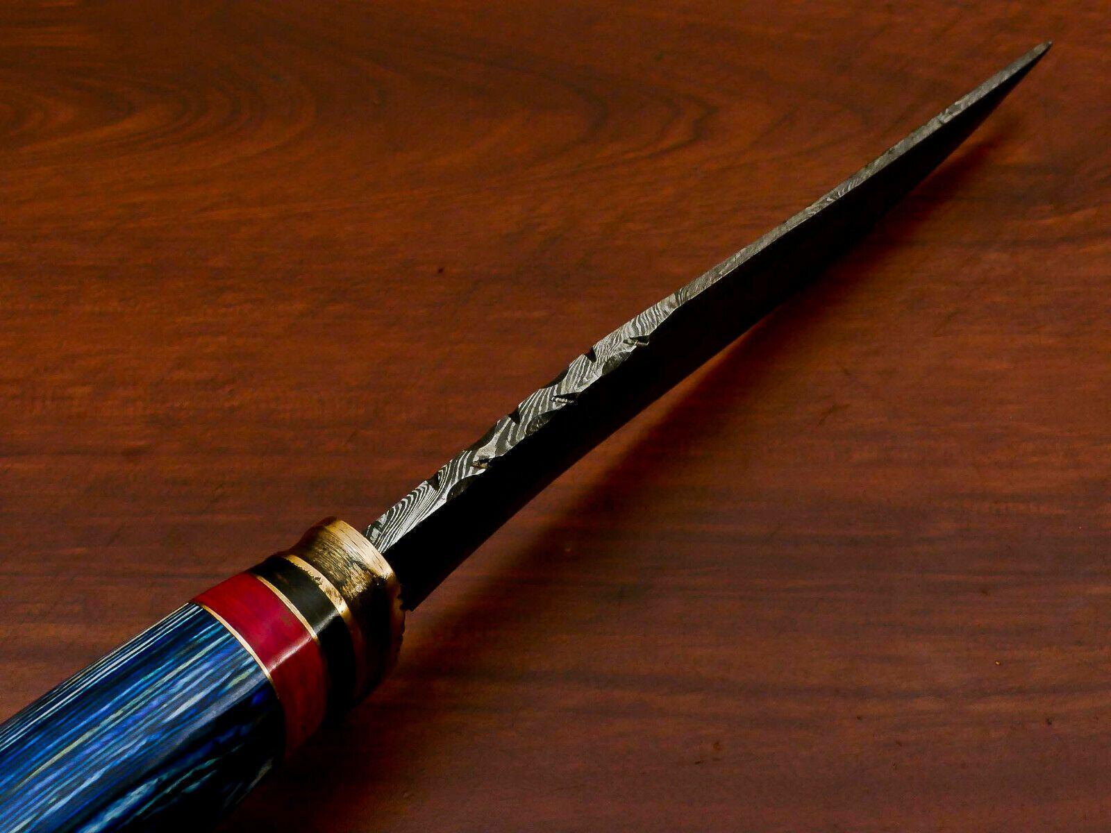 The Pakka wood handle provides a comfortable, ergonomic grip, complemented by a hand-forged brass guard and butt cap for enhanced balance and protection. With a 6.5" blade length and overall length of 11", this Bowie knife is robust, versatile, and visually striking. Each knife comes with a premium leather sheath, making it a perfect collectible or practical outdoor companion.