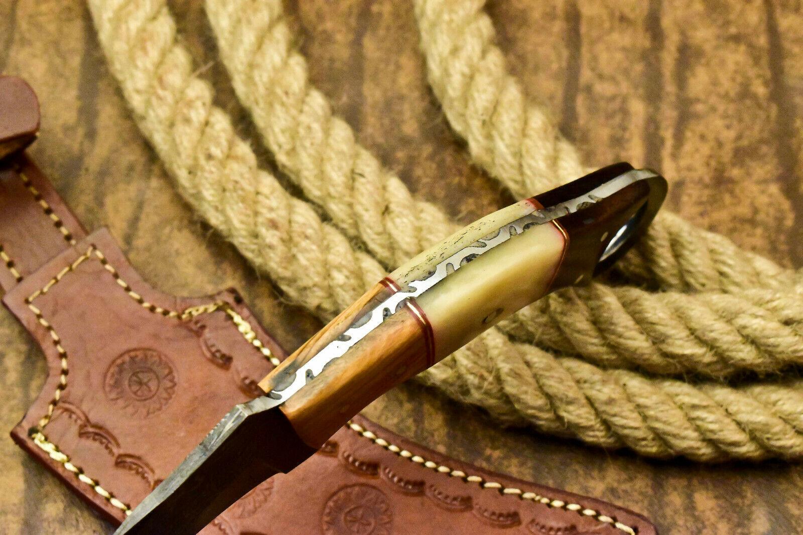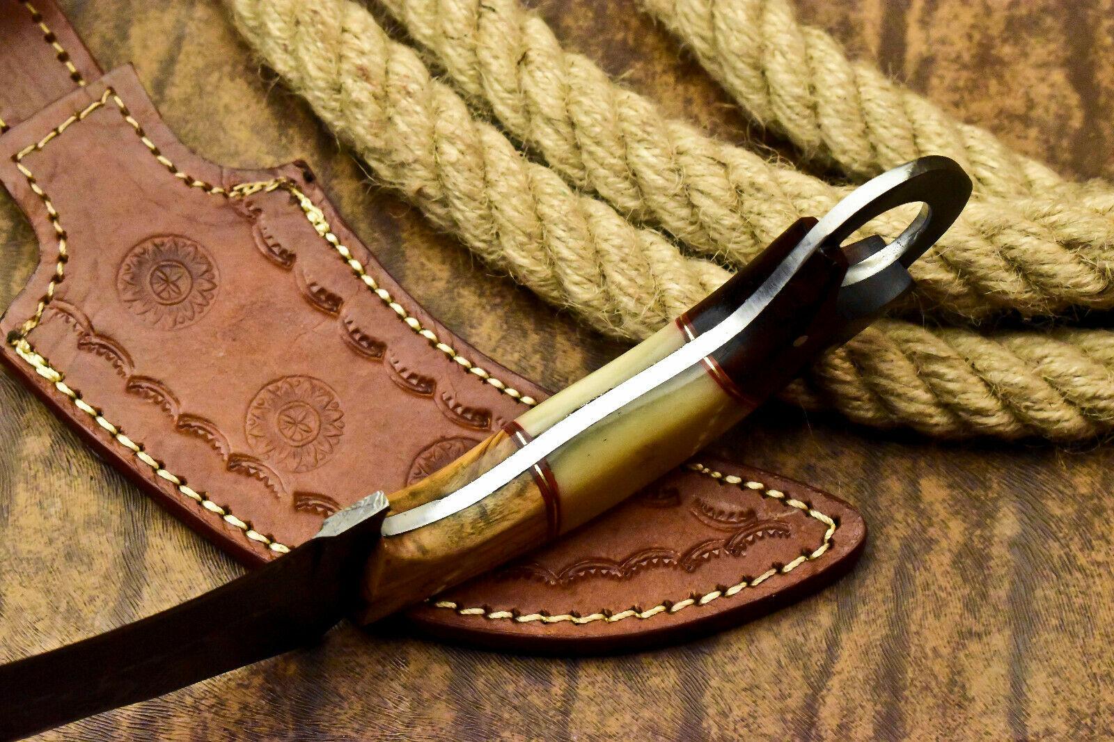 This full tang damascus karambit features a genuine Bone and Wood handle, offering both durability and a distinctive natural appearance.The handle is shaped for a comfortable and secure grip, enhancing control during outdoor tasks. Paired with the included sheath, this karambit with sheath is ready for safe carry and storage.