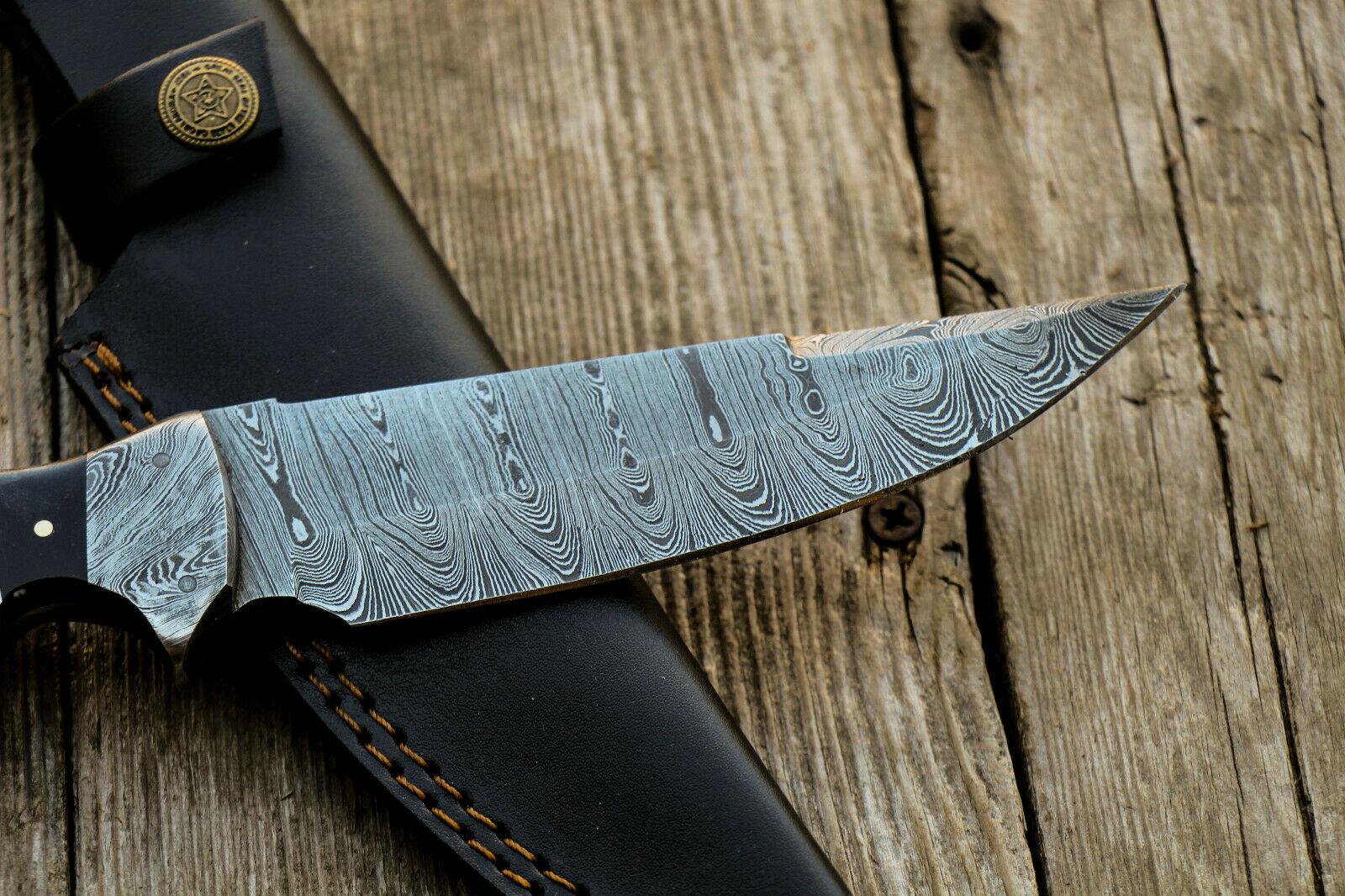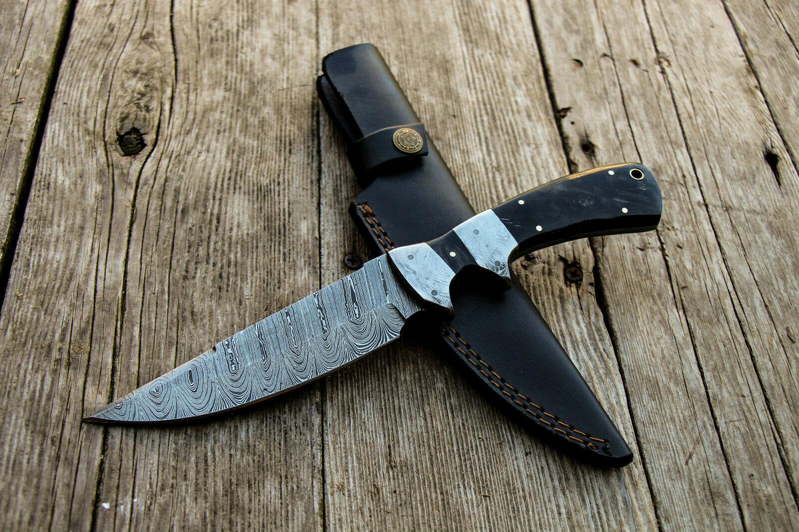 11" Handmade Damascus Steel Bowie Knife | Water Buffalo Horn Handle & Leather Sheath
