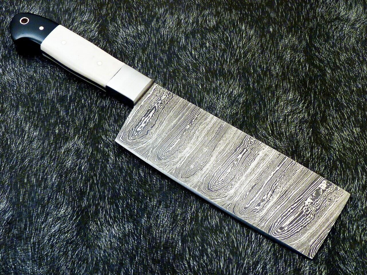 Our blades are made from high-quality Damascus steel, forged over many hours to achieve a stunning pattern of layers flowing seamlessly to the blade's edge. Crafted from 1095 and 15N20 high carbon steel with 512 true layers, this blade features the saw-blade effect at a microscopic level, ensuring superior cutting performance while maintaining sharpness longer than typical blades. The blade has undergone excellent heat treatment, with Rockwell hardness ranging from 50-54 along the edge and 42-45 along the spine. It is 4mm thick with exquisite hand grinds on both sides and a false edge on the top side for enhanced functionality. The handle is made from genuine camel bone, adding both beauty and a firm grip to this exquisite chef’s tool.