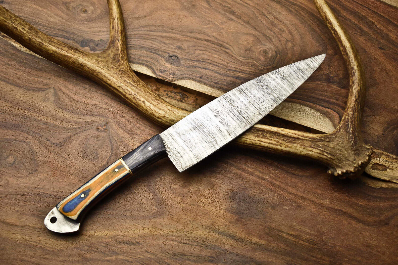 This 12.0" Handmade Damascus Steel Kitchen Chef Knife is a premium full tang blade crafted with precision and strength. The knife features an overall length of 12 inches, including a 5-inch handle and a razor-sharp 7-inch blade, making it ideal for professional chefs and cooking enthusiasts alike. Oil tempered to 58-60 HRC, the blade ensures durability, balance, and superior cutting performance. The edges are sharpened at 20 degrees, providing excellent sharpness for effortless slicing, chopping, and dicing. Forged from 1095 high carbon steel and 15N20 nickel carbon, the blade is folded multiple times to create 384 stunning layers, showcasing the unique Damascus pattern. The acid etching process reveals the striking contrast between nickel’s satin finish and the blackish-gray high carbon steel. Each knife is polished by hand with a high-quality handle and finished edge, making it not only a functional kitchen essential but also a work of art for any collection.