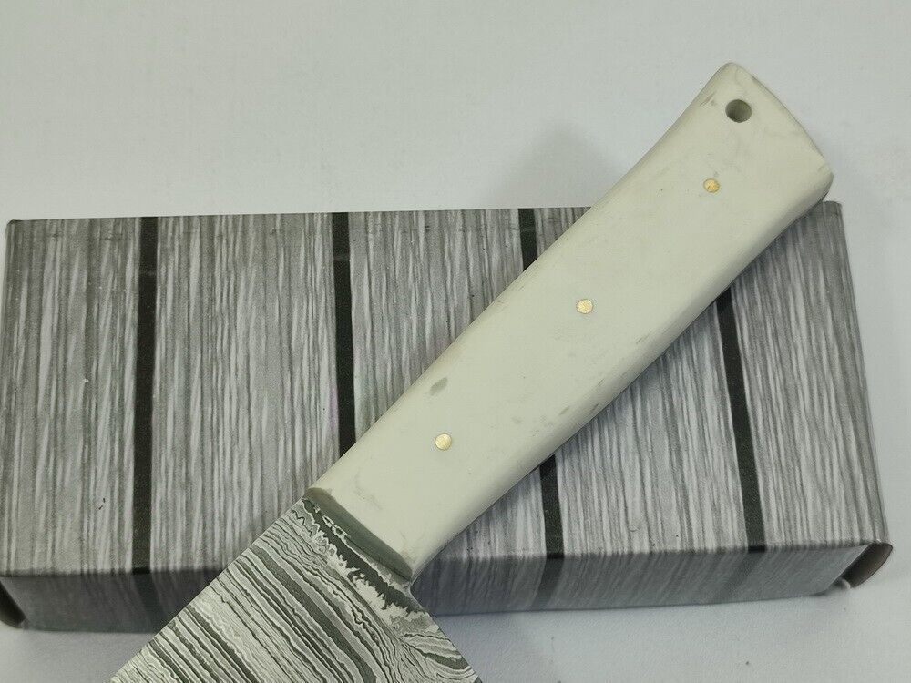 This 12.0" Handmade Fixed Damascus Blade Resin Kitchen Full Tang Chef Knife with Sheath is a versatile and durable kitchen and hunting tool. Hand-forged from high-quality Damascus steel, this knife features a 7-inch blade and a 5-inch resin handle, offering excellent balance and control. The saw-blade effect at a microscopic level allows the blade to maintain sharpness longer than ordinary knives. Expertly heat-treated with optimal Rockwell hardness, it ensures superior cutting performance, capable of handling tough tasks, even chopping iron wires while retaining its edge. Each knife is 100% handmade, unique, and built to last, making it ideal for chefs, hunters, collectors, and outdoor enthusiasts. Comes complete with a protective sheath for safe storage and transport.