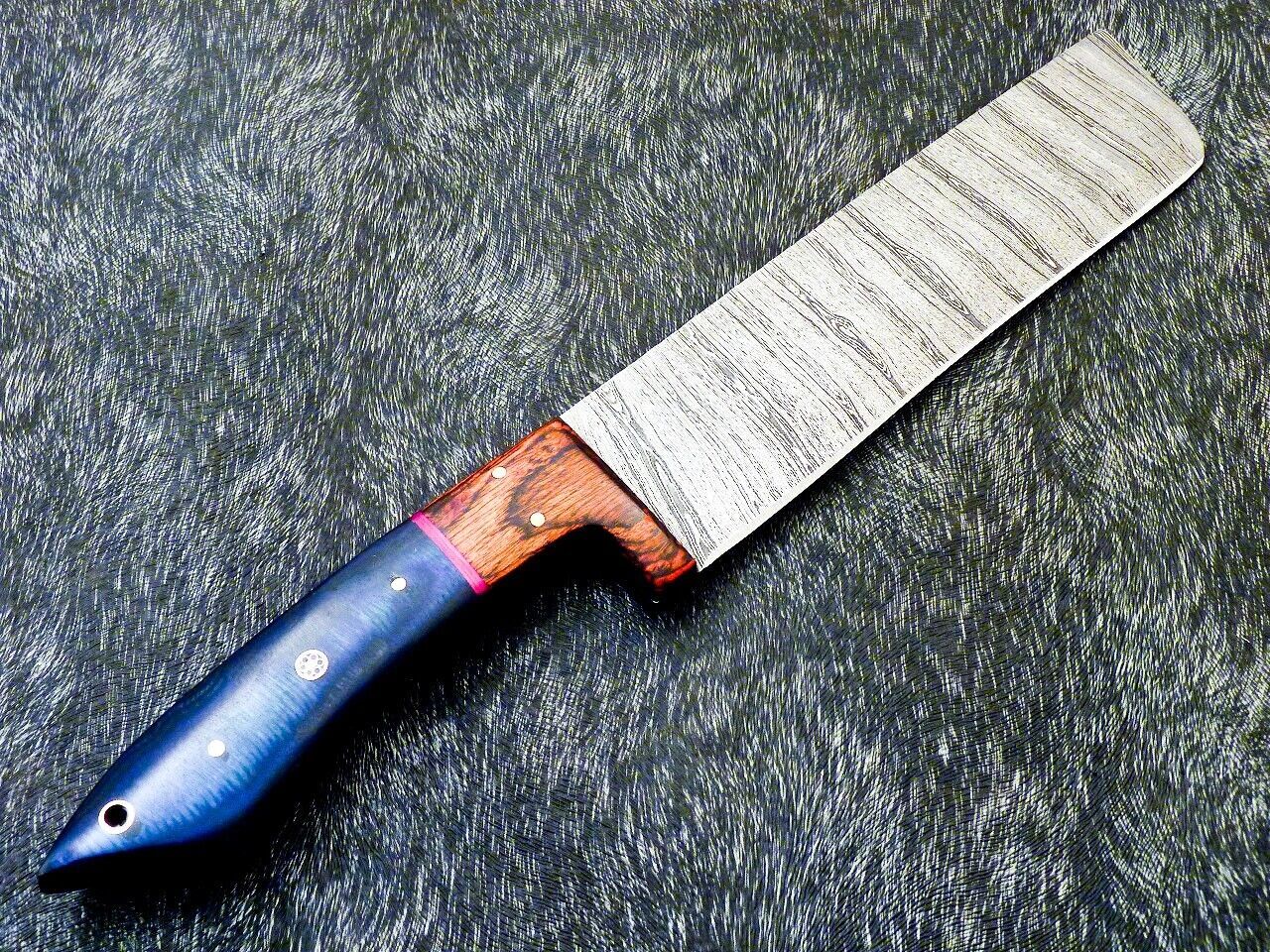 This 12.0" handmade Damascus steel chef knife is crafted with precision for professional chefs and cooking enthusiasts. The knife features a 7.0" Damascus blade made from 1095 and 15N20 high-carbon steel, folded into 512 true layers to create a stunning pattern that flows seamlessly to the edge. With a 5.0" hard wood handle, it offers a comfortable and firm grip for long kitchen sessions. The blade undergoes excellent heat treatment, giving it a Rockwell hardness of 50–54 along the edge and 42–45 along the spine. The 4mm thick blade has been hand-forged and ground on both sides, ensuring durability, sharpness, and balance. Its microscopic saw-blade effect allows it to stay sharp longer than standard knives, making it ideal for slicing, chopping, and dicing. Each knife is custom made, giving you a unique tool designed to last for years. Please note: this knife is sold without a leather sheath.