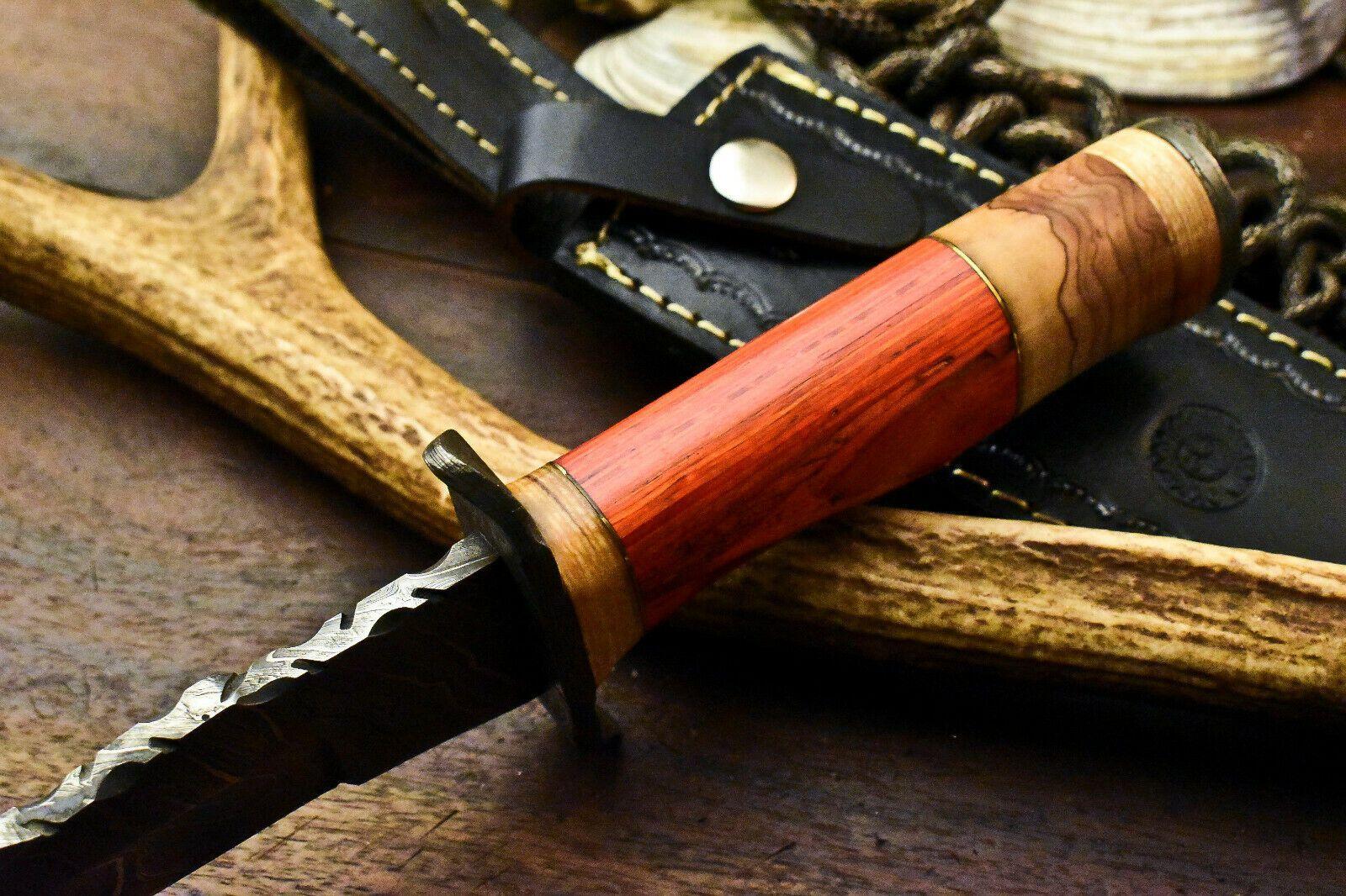 12.5" Handmade Damascus Bowie Knife – Hardwood Handle & Leather Sheath