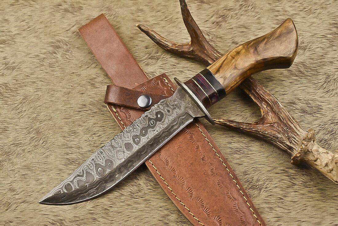 12.5" Handmade Damascus Steel Bowie Knife with Olive Wood Handle & Leather Sheath