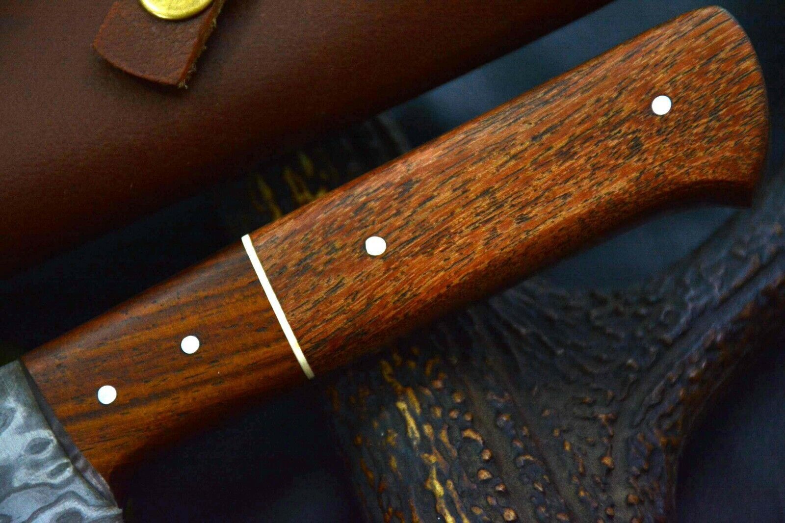 Hand wash the knife with mild soap and warm water, then dry immediately with a soft cloth. To preserve the blade’s shine and prevent rust, apply a thin coat of food-safe mineral oil regularly. Avoid dishwashers and prolonged soaking in water. Always store in the leather sheath when not in use.