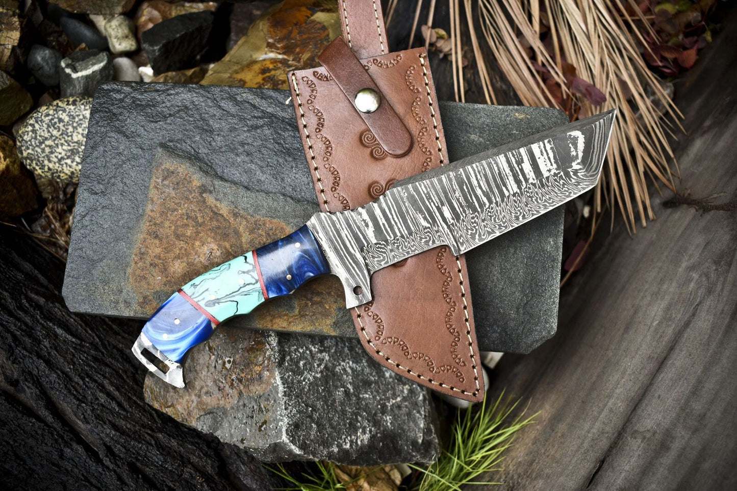 This Handmade Hand-Forged Damascus Tracker Knife is a powerful and versatile tool, designed for hunters, campers, and bushcraft enthusiasts who demand reliability and strength in the outdoors. Measuring approximately 12.5 inches overall, this knife features a 7.5-inch twist-pattern Damascus steel blade and a 5-inch Micarta handle with a Micarta bolster for superior grip, balance, and durability.The blade is expertly crafted from a blend of 1095 high carbon steel and 15N20 nickel steel, folded and forged to create hundreds of striking layers. The twist Damascus design offers not only visual appeal but also incredible toughness and cutting performance. Each blade is oil tempered to 58–60 HRC, ensuring razor-sharp precision and long-lasting edge retention even under intense use.This tracker knife is built to handle multiple survival and outdoor tasks, including chopping wood, skinning game, gutting, carving, splitting, and scraping. It also features a draw knife area, making it perfect for bow making and fast timber shaping. The ergonomic Micarta handle ensures a secure and comfortable hold, even in challenging environments.