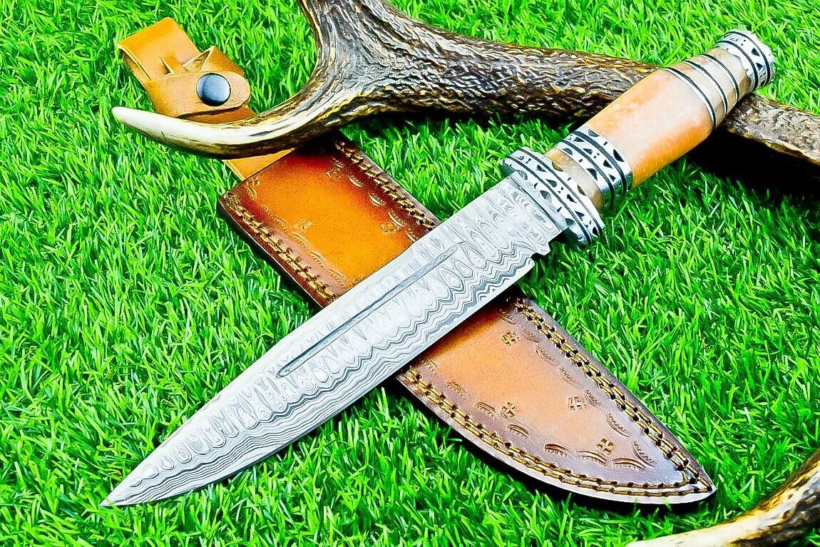 This 12.5 inch Damascus steel Bowie knife is a handcrafted masterpiece designed for outdoor adventurers, collectors, and knife enthusiasts. The blade is forged using high carbon 1095 and 15N20 nickel steel, repeatedly folded and treated to create 384 layers of genuine Damascus pattern—an artful blend of strength and beauty.