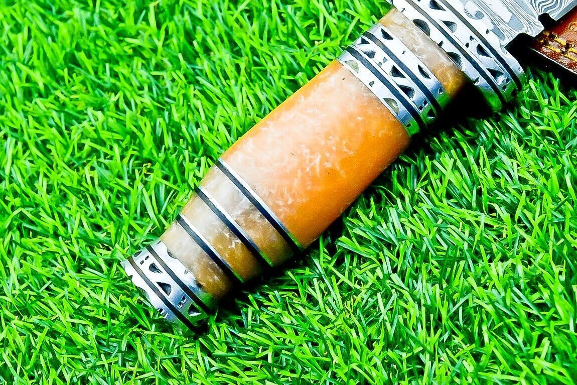 The resin handle, paired with a hand-casted engraved steel bolster, adds an elegant and durable finish while providing a comfortable grip. The full tang construction ensures rugged performance, making it ideal for camping, hunting, and survival.