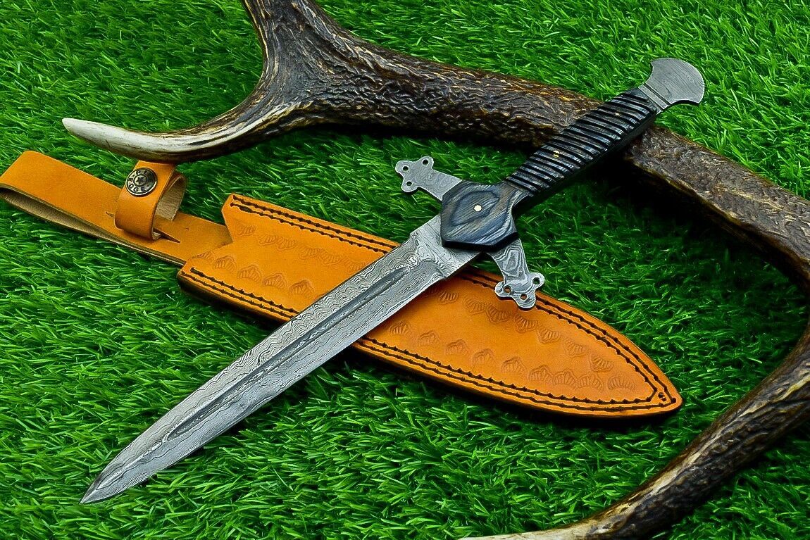 Experience unmatched craftsmanship with this 12.5 inch handmade Damascus steel Bowie dagger, meticulously forged for durability, elegance, and performance. This custom hunting and camping knife features a hand-forged Damascus blade crafted from 1095HC and 15N20 nickel carbon steel, folded into 384 layers to create a striking pattern and razor-sharp edge. The result is a blade with incredible edge retention and toughness — ideal for serious outdoor and survival use.