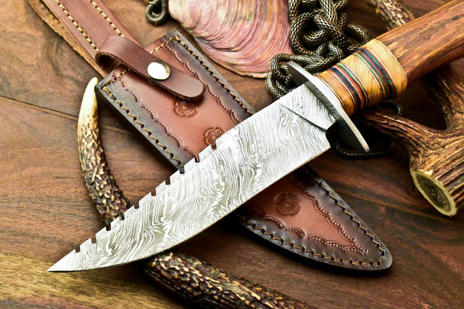 The ergonomic Walnut wood handle provides a secure and comfortable grip, complemented by full tang construction for enhanced balance and durability. Every knife comes with a premium sheath, making it ideal for hunting, camping, bushcraft, or as a collectible Damascus knife. Its intricate layered pattern from authentic Damascus steel reflects the hours of skilled craftsmanship, creating a truly unique blade that stands out in any collection.