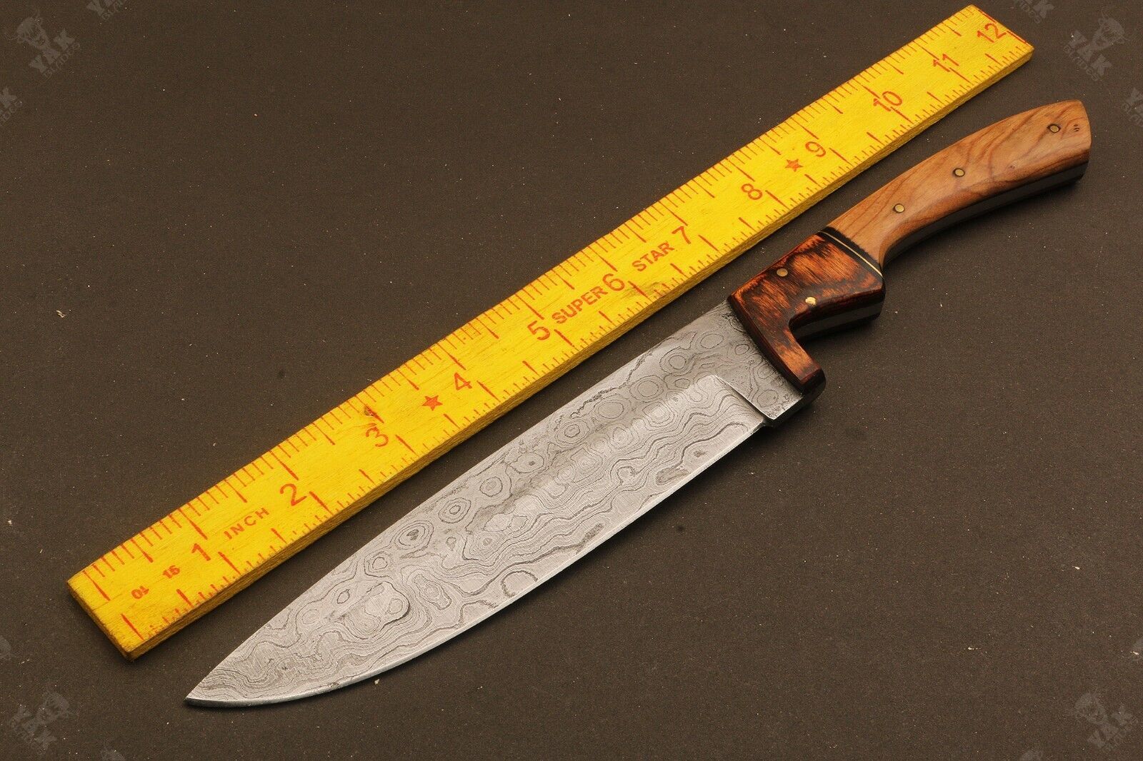 This 12-inch Custom Hand Forged Raindrop Damascus Steel Santoku Chef Knife is a perfect combination of artistry, precision, and durability for both professional chefs and home cooking enthusiasts. The 7-inch blade is hand-forged from premium Damascus steel with a unique raindrop pattern, created through hours of meticulous layering and forging, resulting in a microscopic saw-tooth edge that stays sharp longer than standard blades. The 5-inch handle is crafted from stained camel bone and natural wood, accented with brass spacers and a handmade Damascus steel bolster for superior grip and elegance. Fully functional and 100% handmade, this Santoku knife excels in chopping, slicing, and dicing, making it ideal for kitchen use, culinary gifting, or as a collectible piece for knife enthusiasts. Its robust 4 mm thick blade ensures long-lasting strength, precision, and reliability.